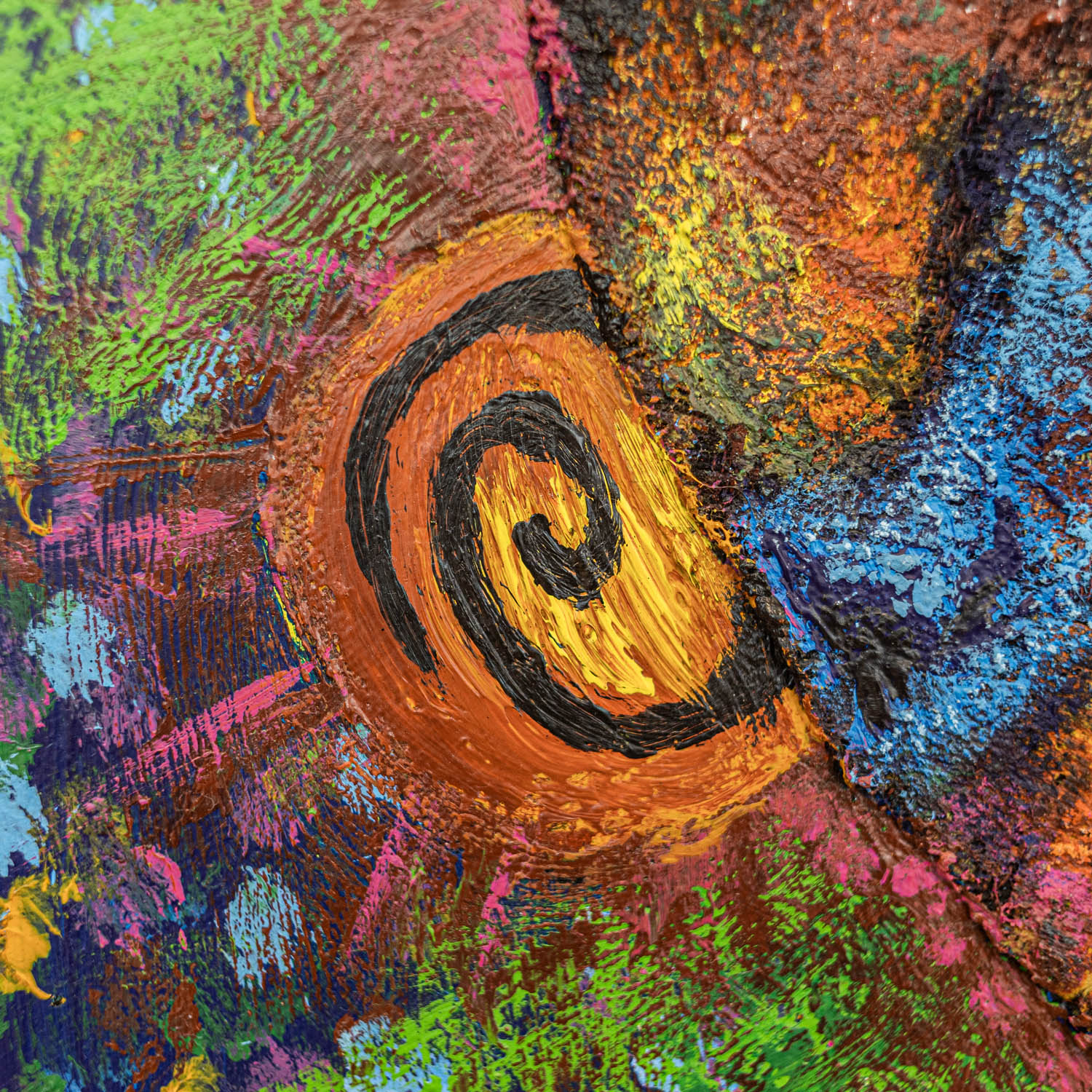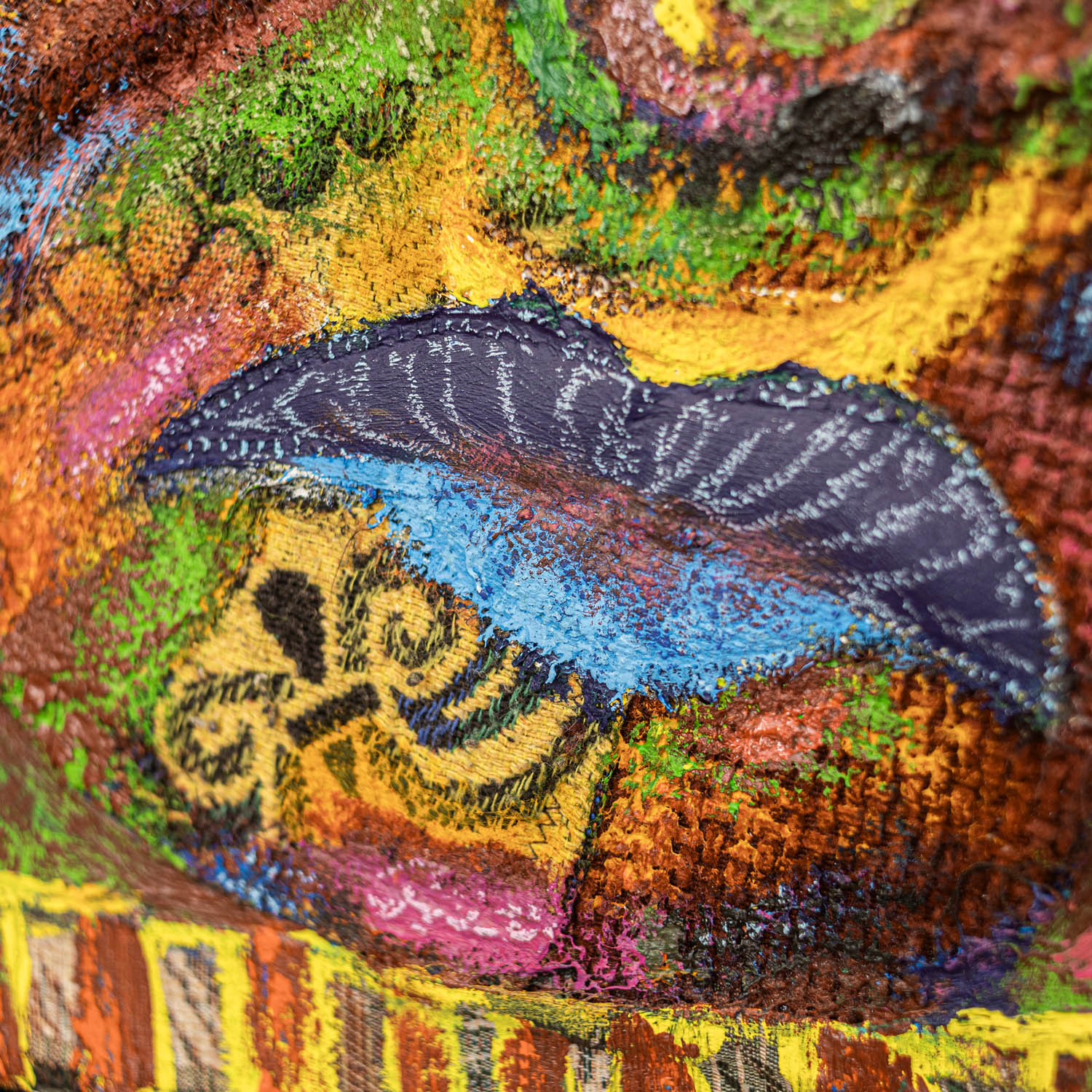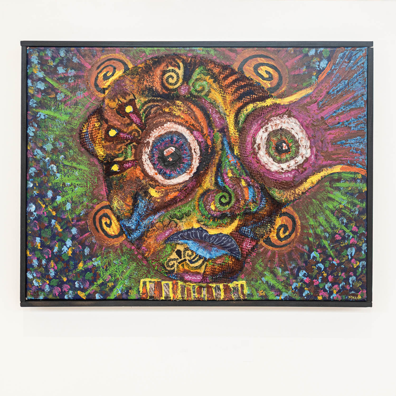 Pēkere is a self-taught artist; while their interests include animation and film, their primary artistic medium is painting. Pēkere's creative practice serves as an extension of their emotional expression, allowing them to convey feelings through art that cannot be articulated verbally.Clara Hakaraia reflects on Pēkere and their toi below:“Pēkere is an artist that exudes their own unique visual language in everything they make. Meeting their art for the first time was similar to meeting them. Each painting, intriguing and distinctive. A spectrum of the many colourful versions of ourselves we carry within. At their very first exhibition at Pātaka, I remember silently observing something that felt hugely intimate, a sense that I already knew who they were just from the works I encountered. The first painting I bought from them was a small canvas of a sad face made with fabric and paint, that now hangs above my couch. They feel like my friends that although can’t talk, provide some other level of comfort and knowing that I don’t possess. A raw and deep expression of emotion through the solitary dance that is painting. I truly feel something when I look at their work. They speak to a part of me I cannot quite comprehend in words, perhaps a state of Te Kore. The realm of infinite potential, growth from the darkness, welcoming the music of light and colour into Te Ao Mārama.”