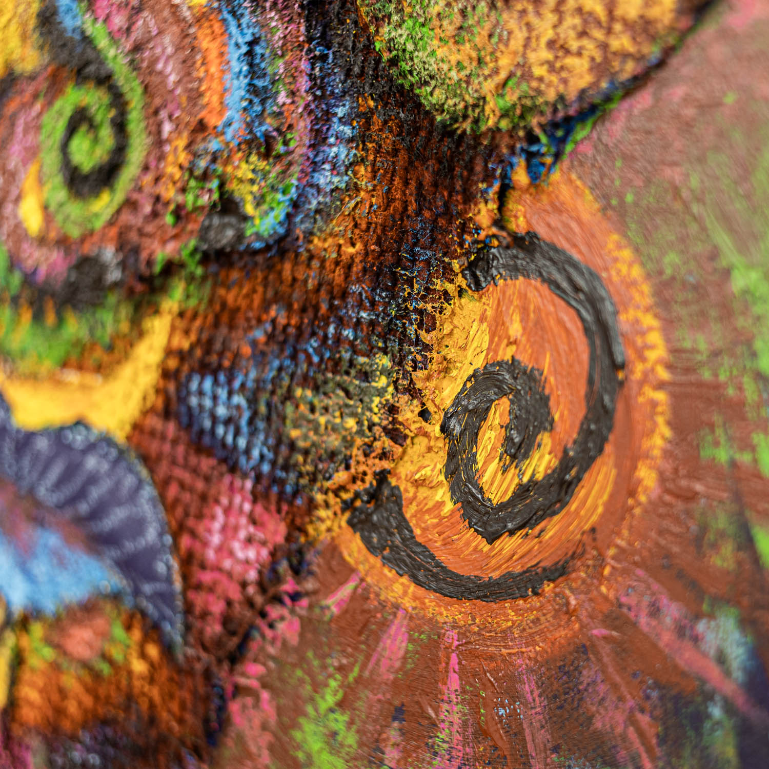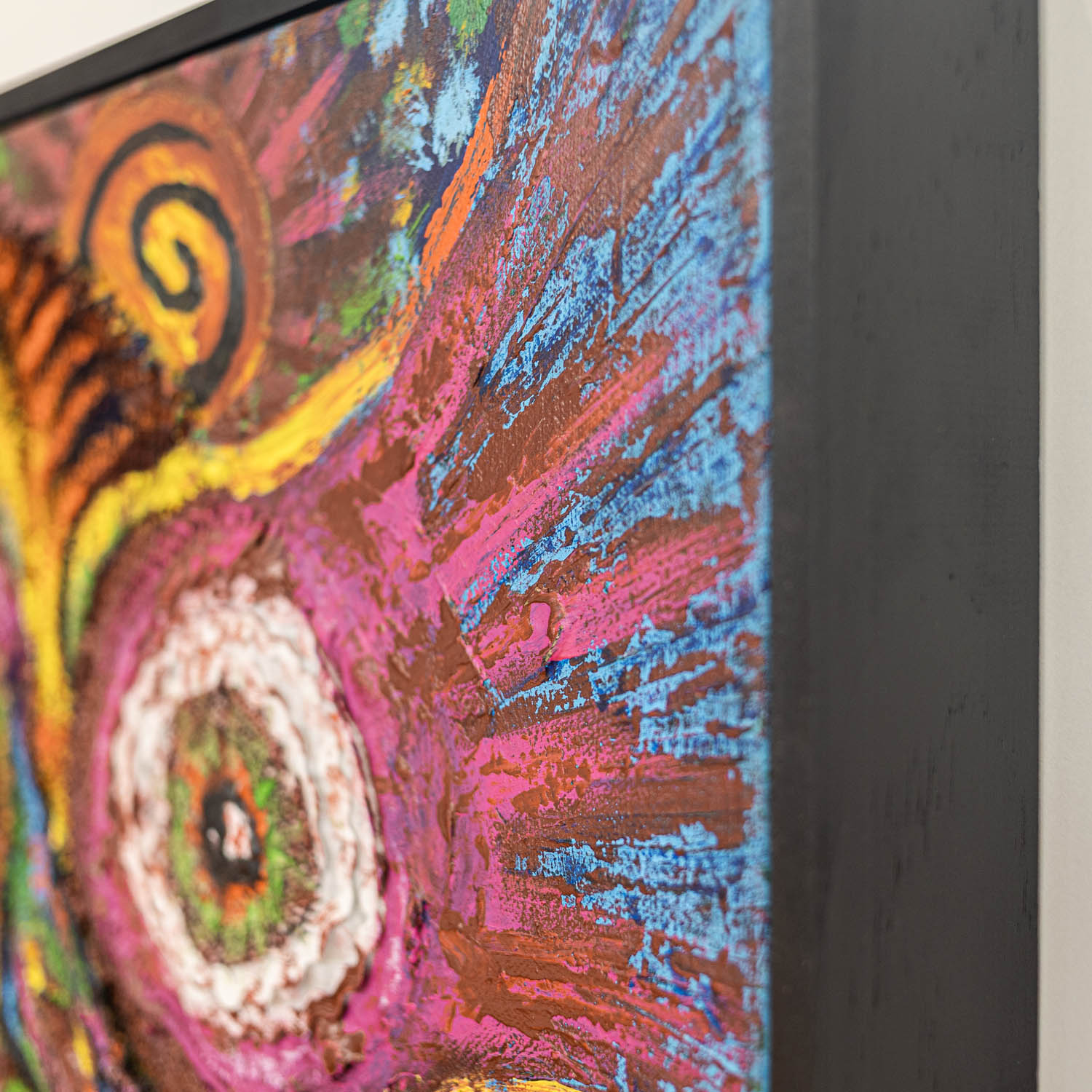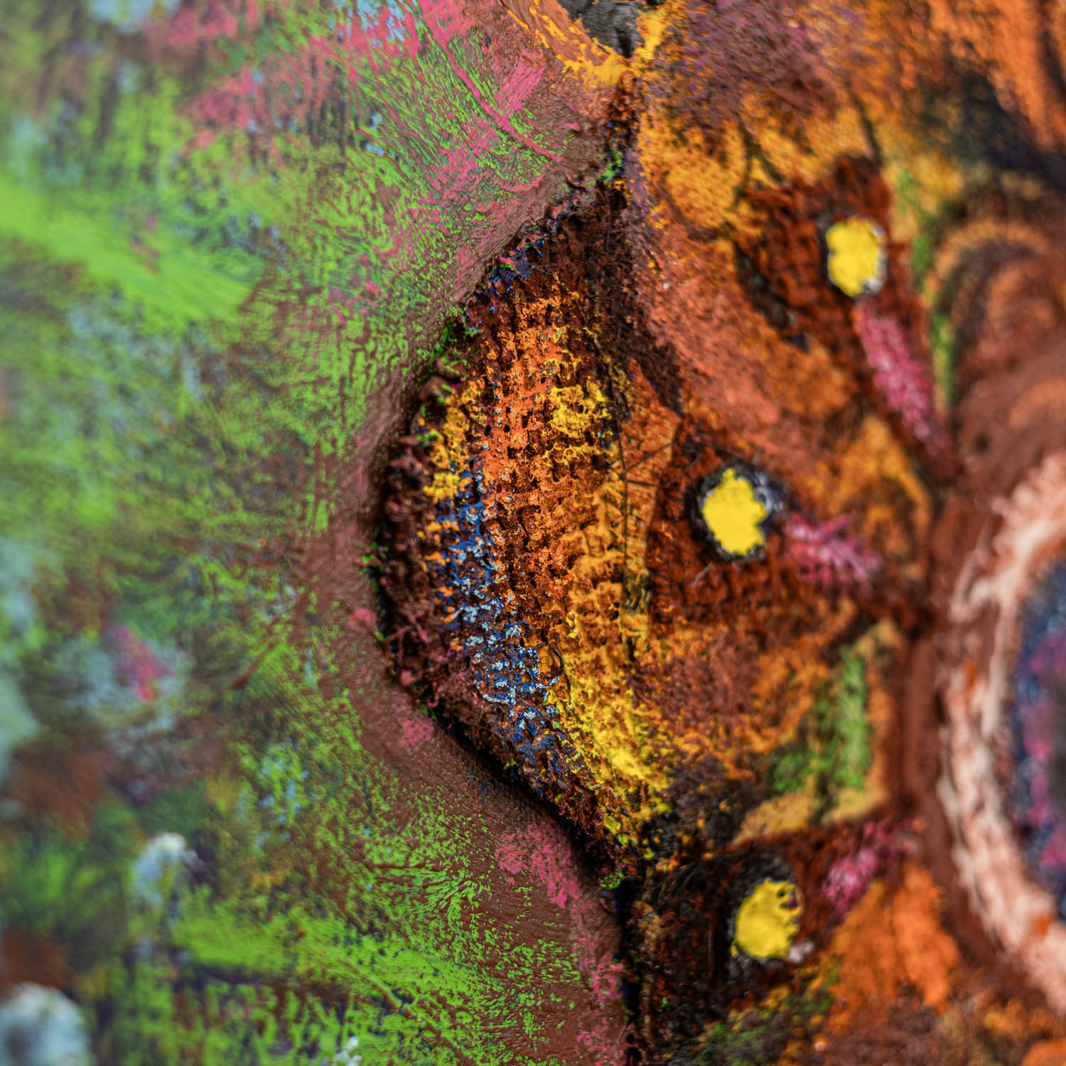 Pēkere is a self-taught artist; while their interests include animation and film, their primary artistic medium is painting. Pēkere's creative practice serves as an extension of their emotional expression, allowing them to convey feelings through art that cannot be articulated verbally.Clara Hakaraia reflects on Pēkere and their toi below:“Pēkere is an artist that exudes their own unique visual language in everything they make. Meeting their art for the first time was similar to meeting them. Each painting, intriguing and distinctive. A spectrum of the many colourful versions of ourselves we carry within. At their very first exhibition at Pātaka, I remember silently observing something that felt hugely intimate, a sense that I already knew who they were just from the works I encountered. The first painting I bought from them was a small canvas of a sad face made with fabric and paint, that now hangs above my couch. They feel like my friends that although can’t talk, provide some other level of comfort and knowing that I don’t possess. A raw and deep expression of emotion through the solitary dance that is painting. I truly feel something when I look at their work. They speak to a part of me I cannot quite comprehend in words, perhaps a state of Te Kore. The realm of infinite potential, growth from the darkness, welcoming the music of light and colour into Te Ao Mārama.”