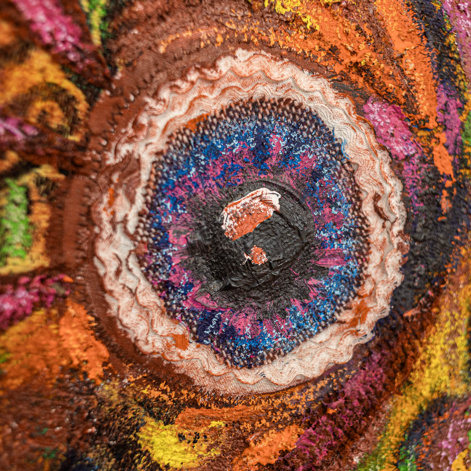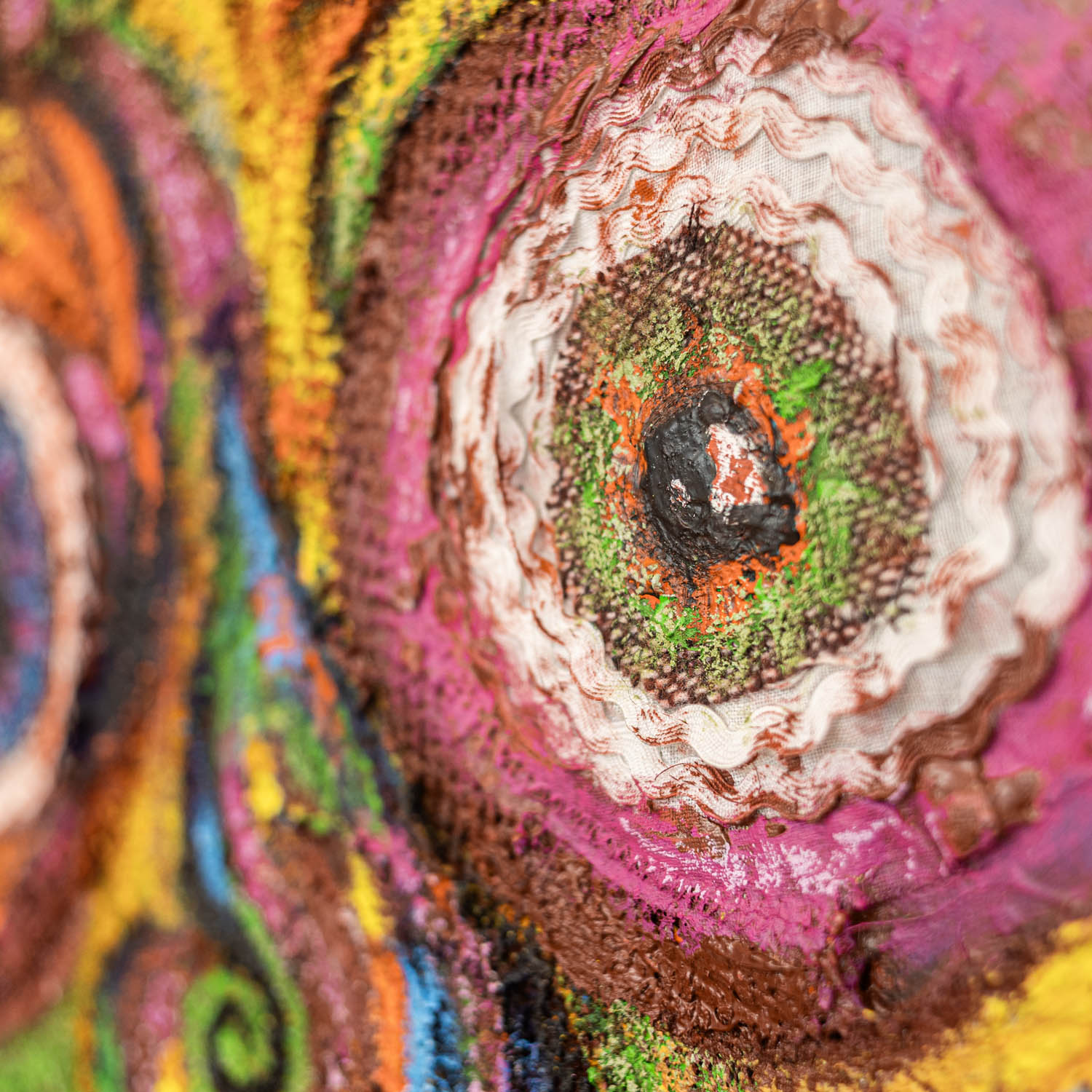 Materials: Acrylic, assorted recycled fabric, oil pastels, canvas