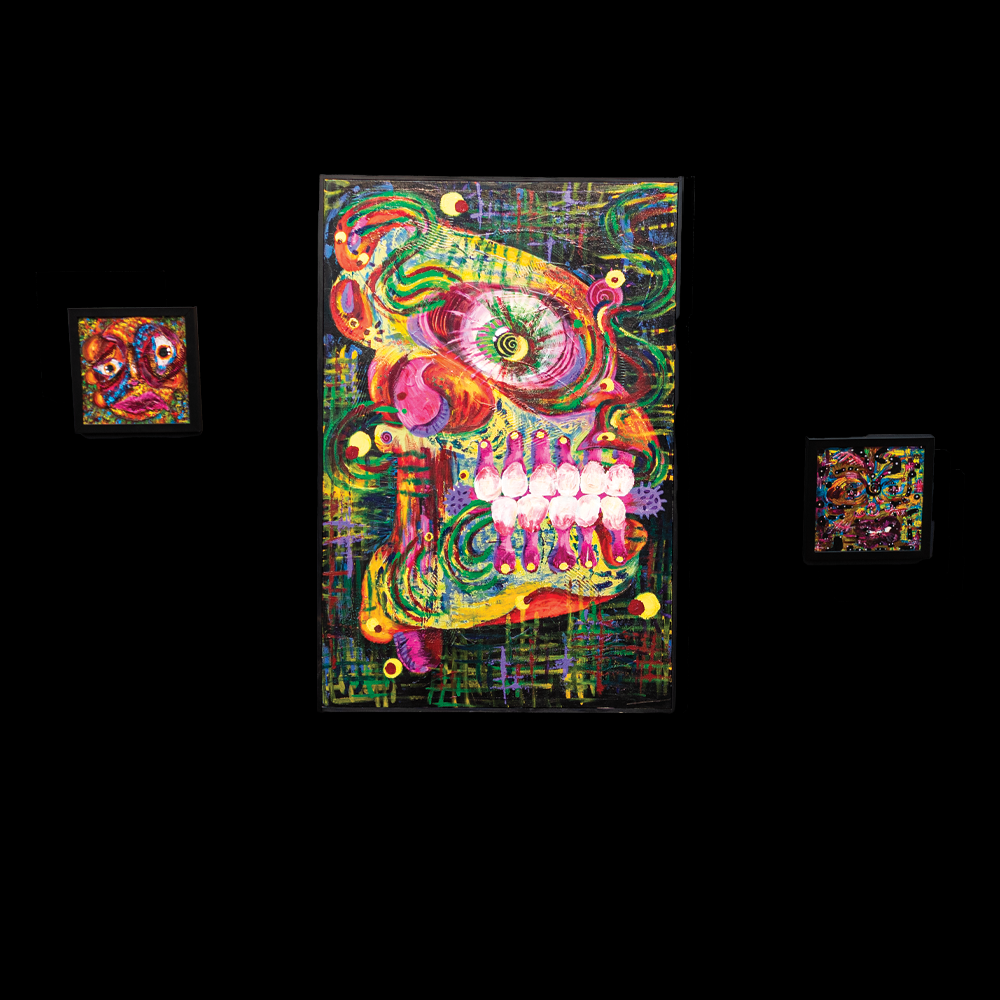 Pēkere is a self-taught artist; while their interests include animation and film, their primary artistic medium is painting. Pēkere's creative practice serves as an extension of their emotional expression, allowing them to convey feelings through art that cannot be articulated verbally.Clara Hakaraia reflects on Pēkere and their toi below:“Pēkere is an artist that exudes their own unique visual language in everything they make. Meeting their art for the first time was similar to meeting them. Each painting, intriguing and distinctive. A spectrum of the many colourful versions of ourselves we carry within. At their very first exhibition at Pātaka, I remember silently observing something that felt hugely intimate, a sense that I already knew who they were just from the works I encountered. The first painting I bought from them was a small canvas of a sad face made with fabric and paint, that now hangs above my couch. They feel like my friends that although can’t talk, provide some other level of comfort and knowing that I don’t possess. A raw and deep expression of emotion through the solitary dance that is painting. I truly feel something when I look at their work. They speak to a part of me I cannot quite comprehend in words, perhaps a state of Te Kore. The realm of infinite potential, growth from the darkness, welcoming the music of light and colour into Te Ao Mārama.”