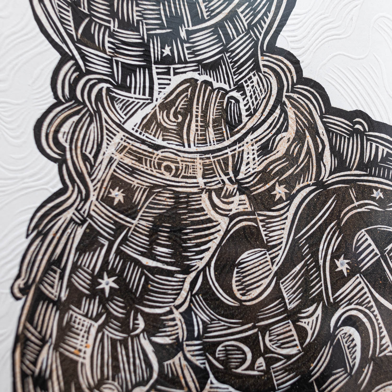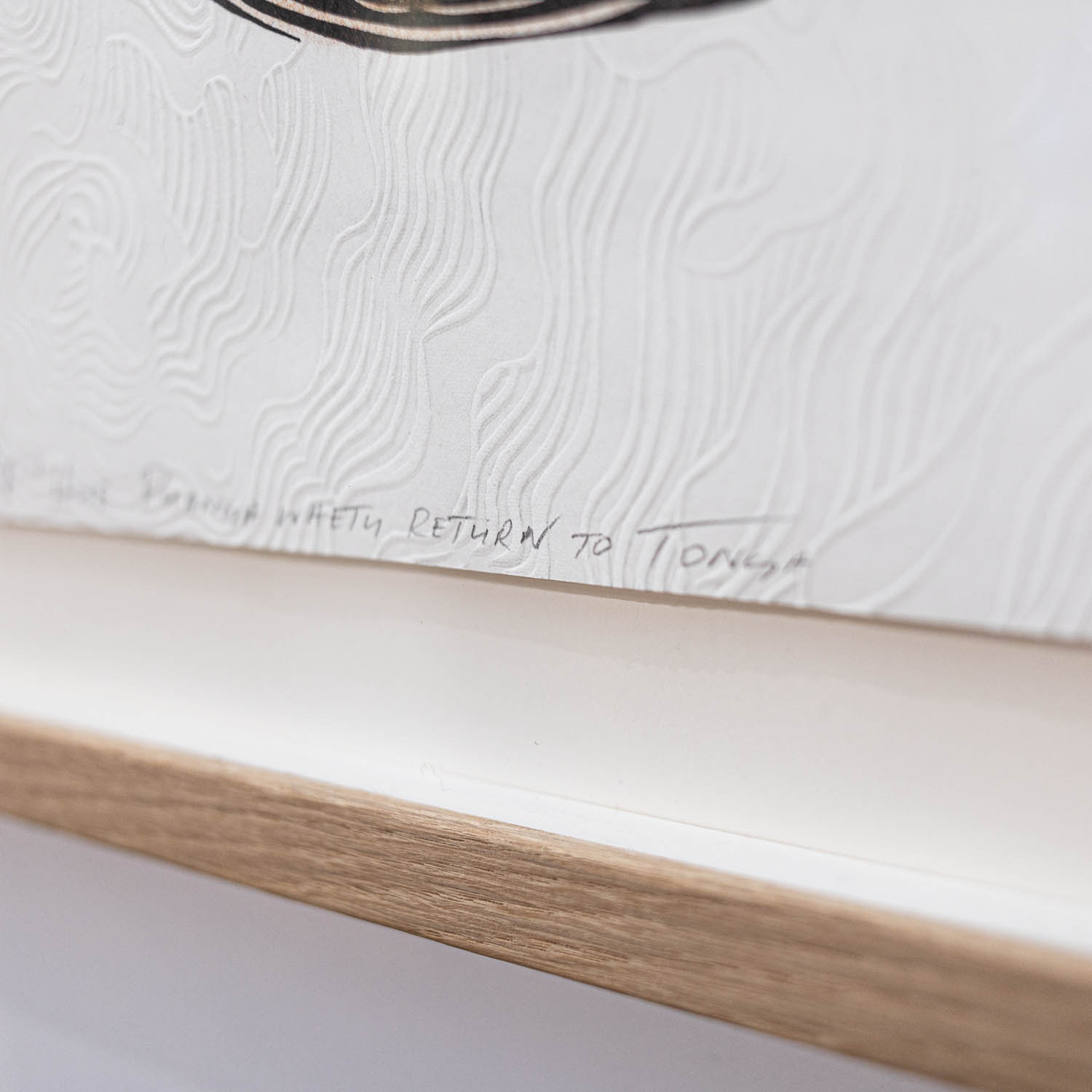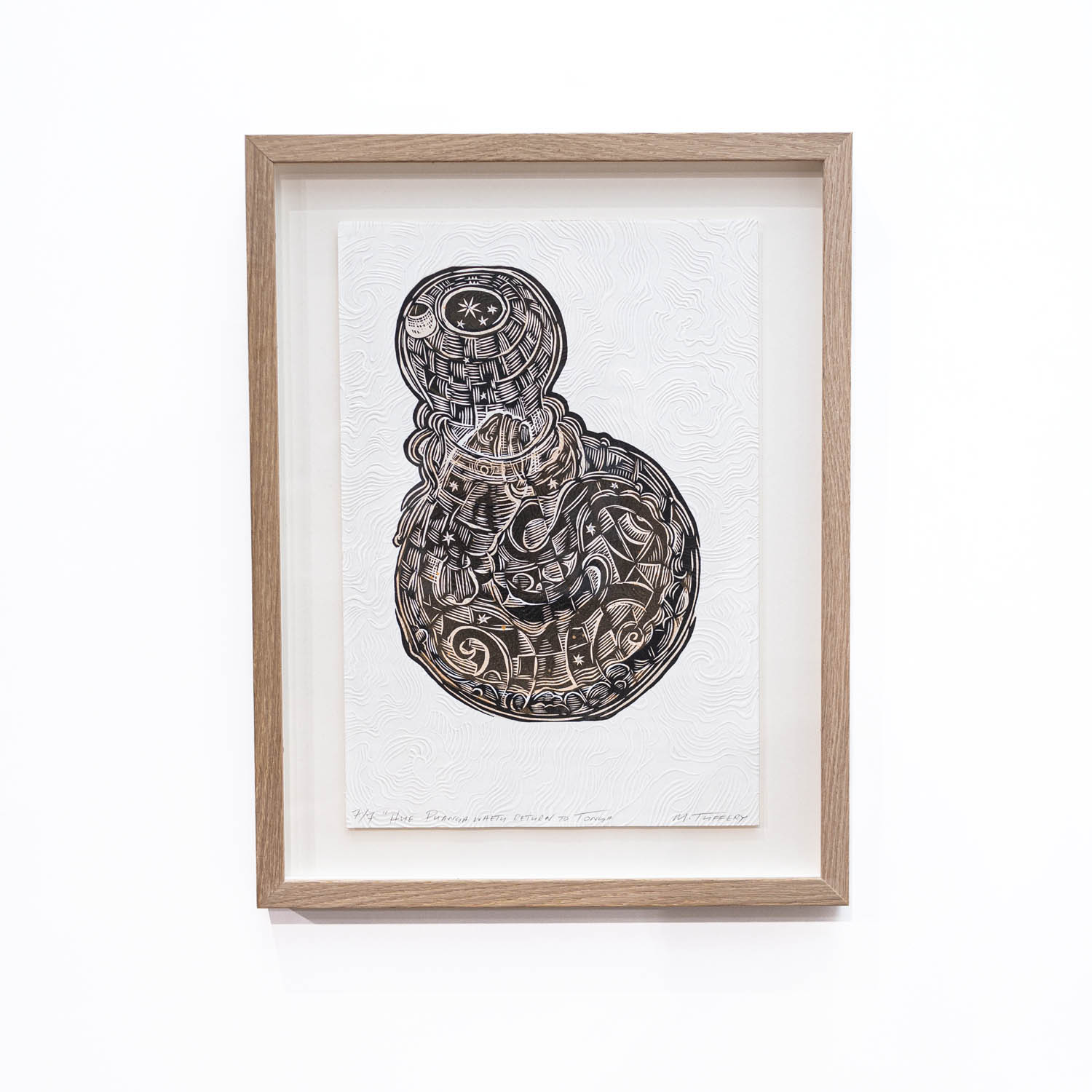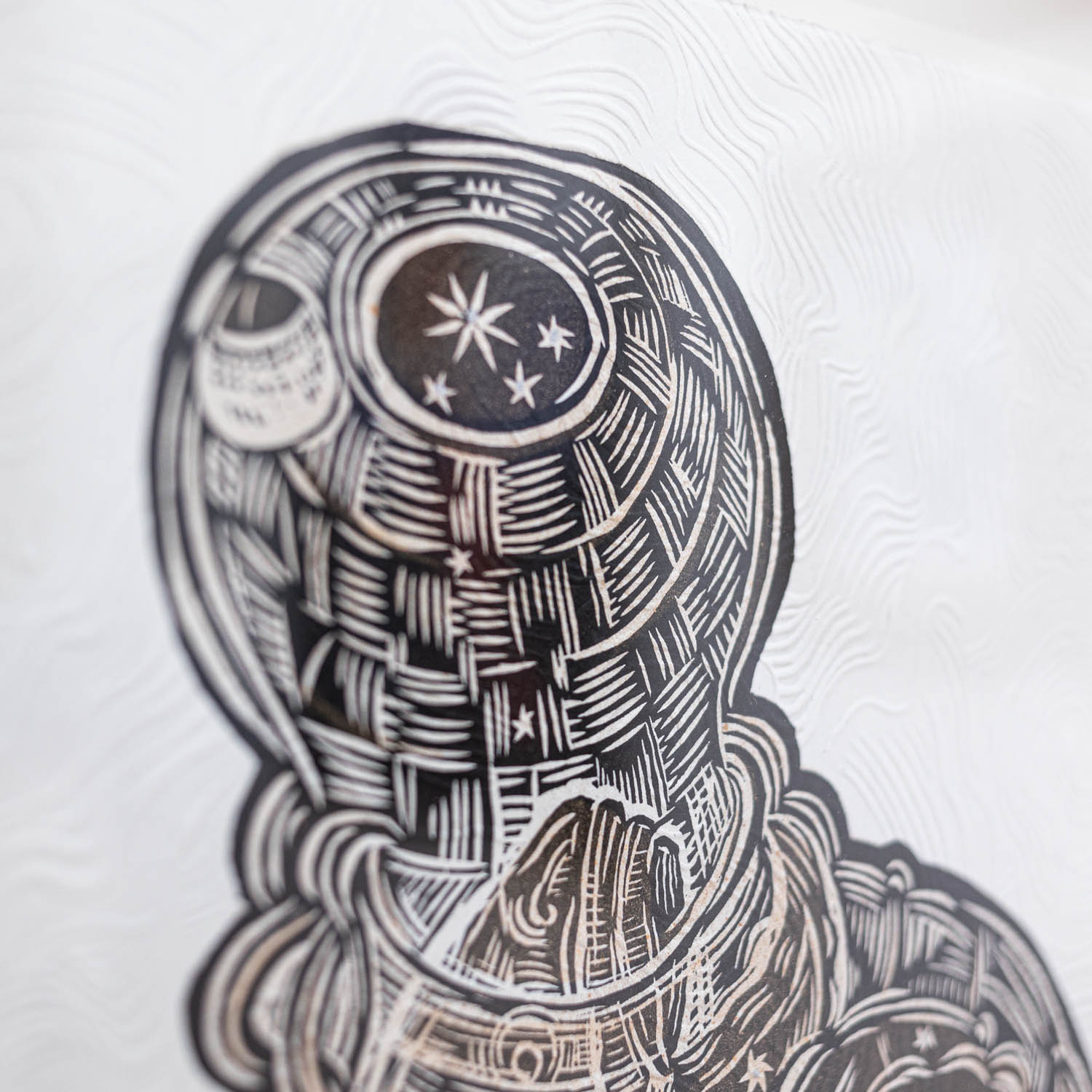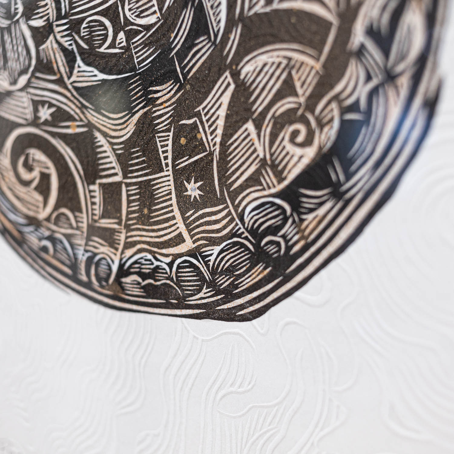 Description: Emboss Stencil Woodcut on Fabriano Tiepolo White 290 gsm Cotton Paper, Oak Frame, Raise & Float, UV Glass.