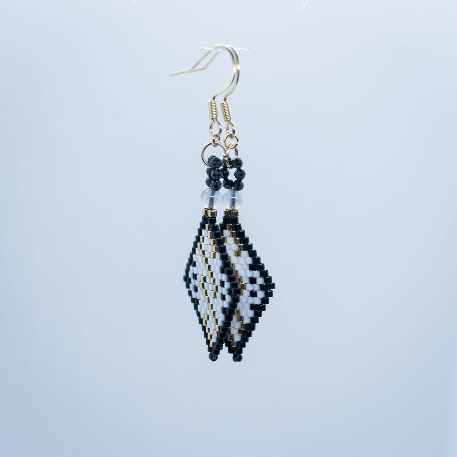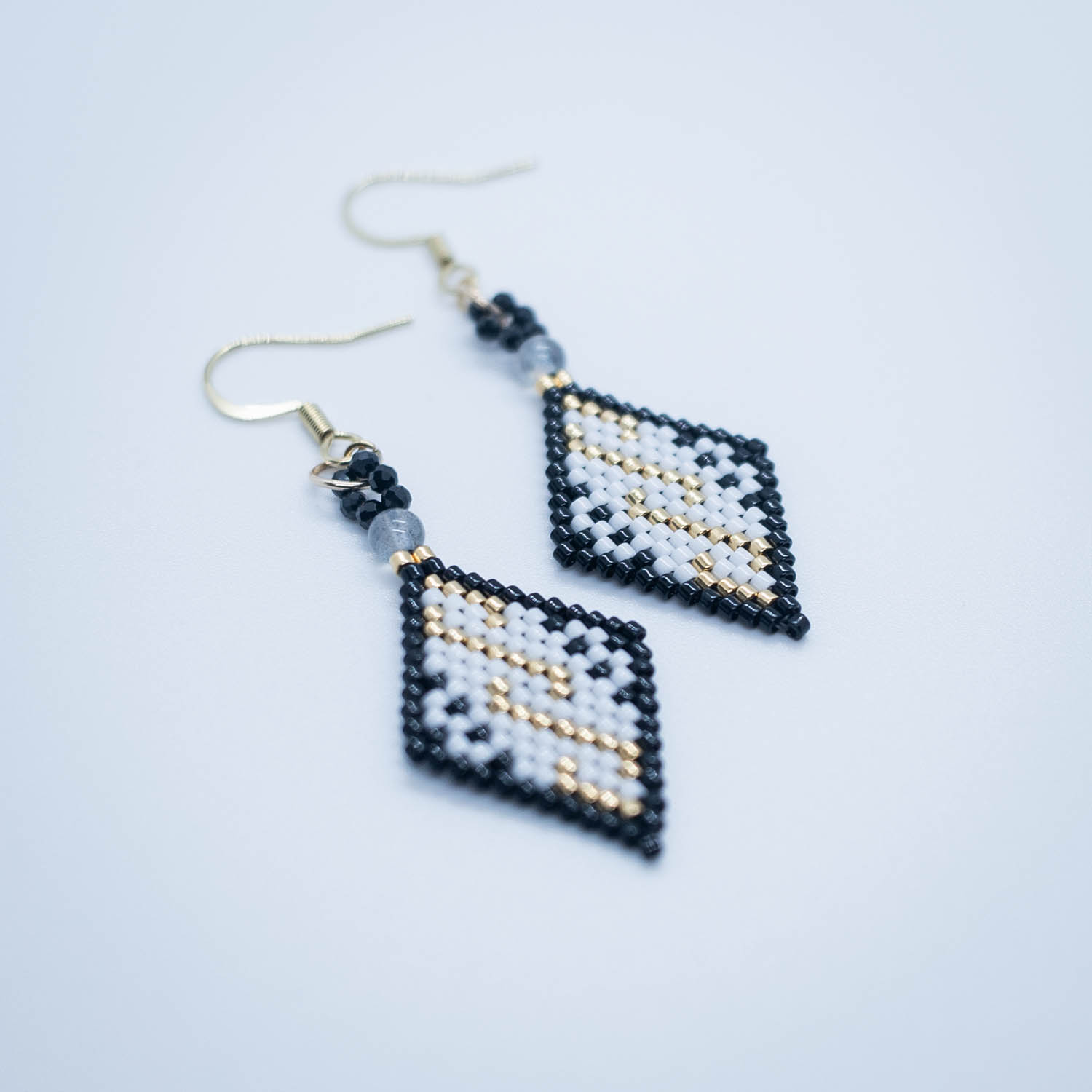 Materials: Stainless steel jewellery findings, Miyuki (Japanese glass beads) 24kt gold glass plated, Black, White, Black Faceted Spinel Stone, Labradorite stone.