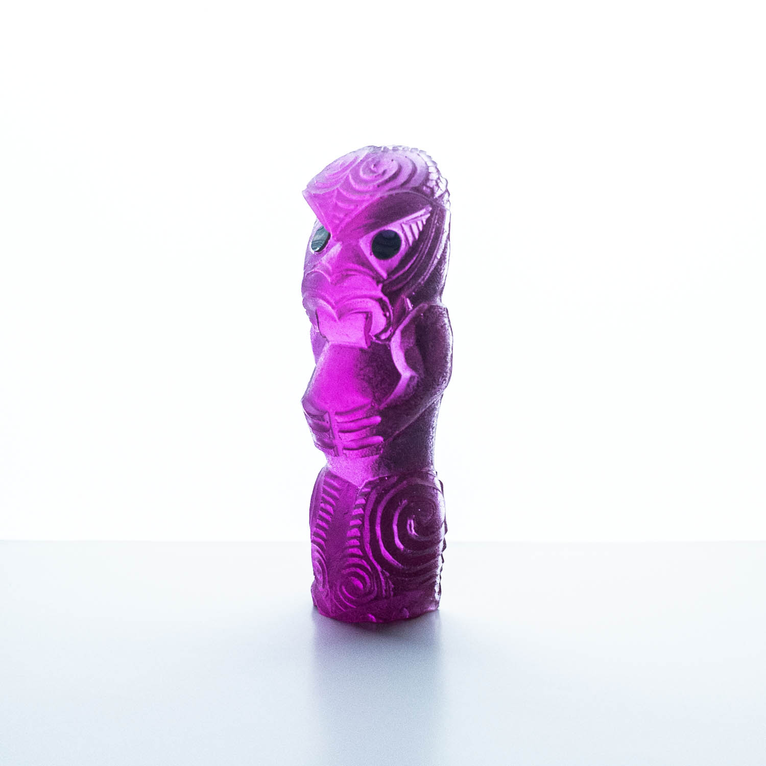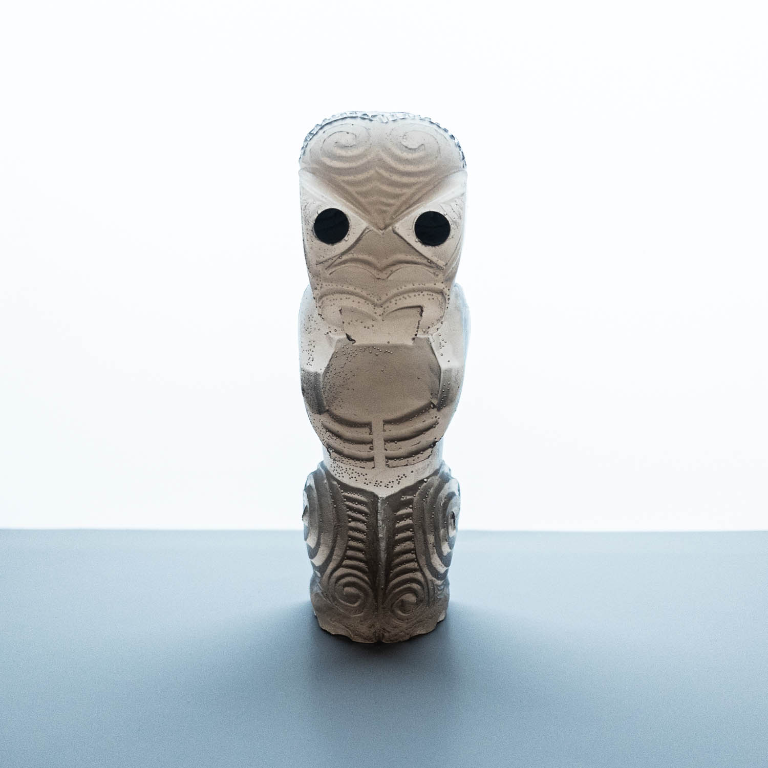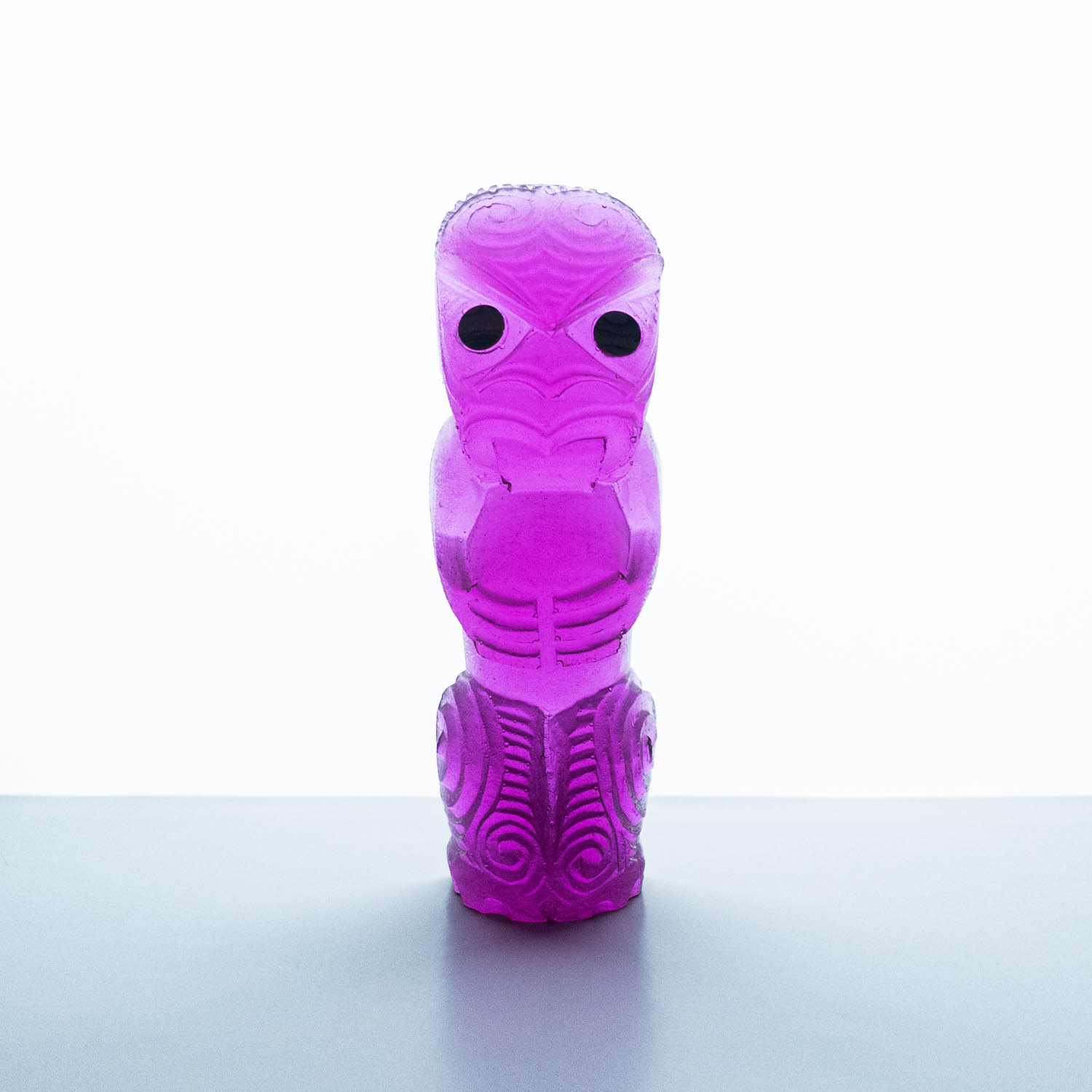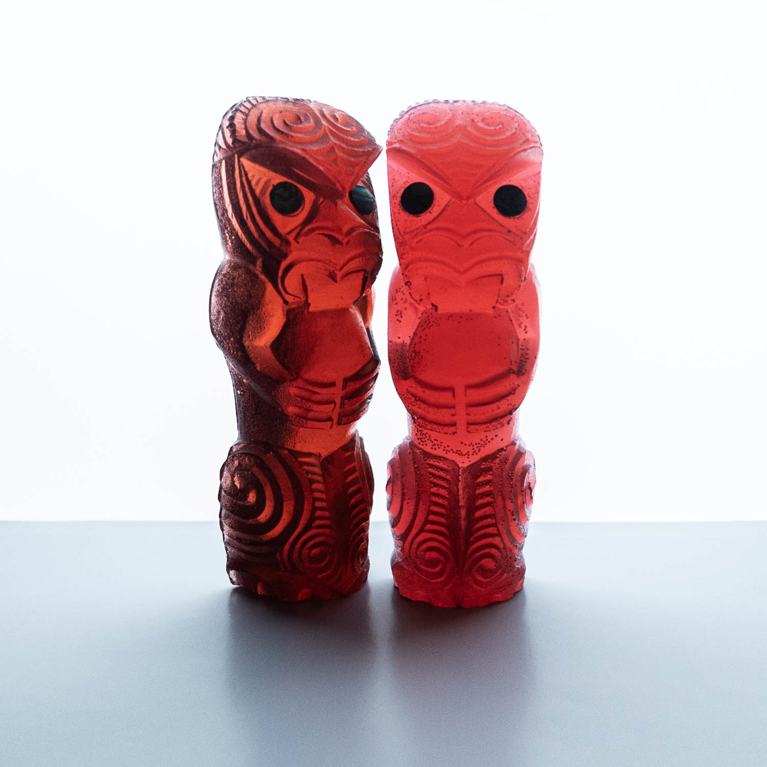 Messini Palace is a self-taught, experimental artist working primarily with resin and plaster. She is a self-sustainable practitioner who creates custom pieces from her studio in central Auckland. After living abroad for a long period, her decision to return home and pursue her art practice aided in her reconnection and reclamation of identity as a wāhine Māori. Some of her projects are collaborations with carver Mike Matchitt- while Matchitt carves into the original blueprint mould, Messini casts resin sculptures from the carved moulds to create a final piece. A selection of Messini’s sculptures is inspired by souvenir pieces of the mid-century era, such as the tiki. This is her way of counter-critiquing trinkets sold to tourists, reclaiming the narrative of taonga tuku iho. Messini’s greatest influence is her whakapapa; many of her pieces represent important tūpuna or kaitiaki.