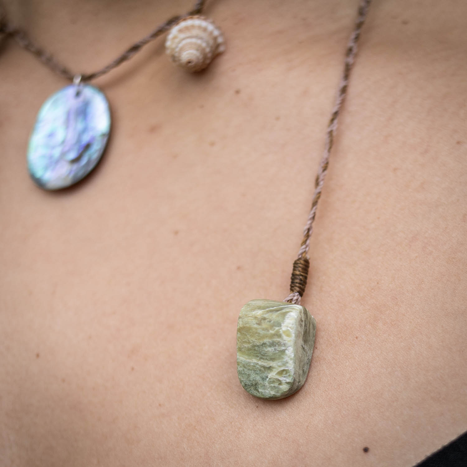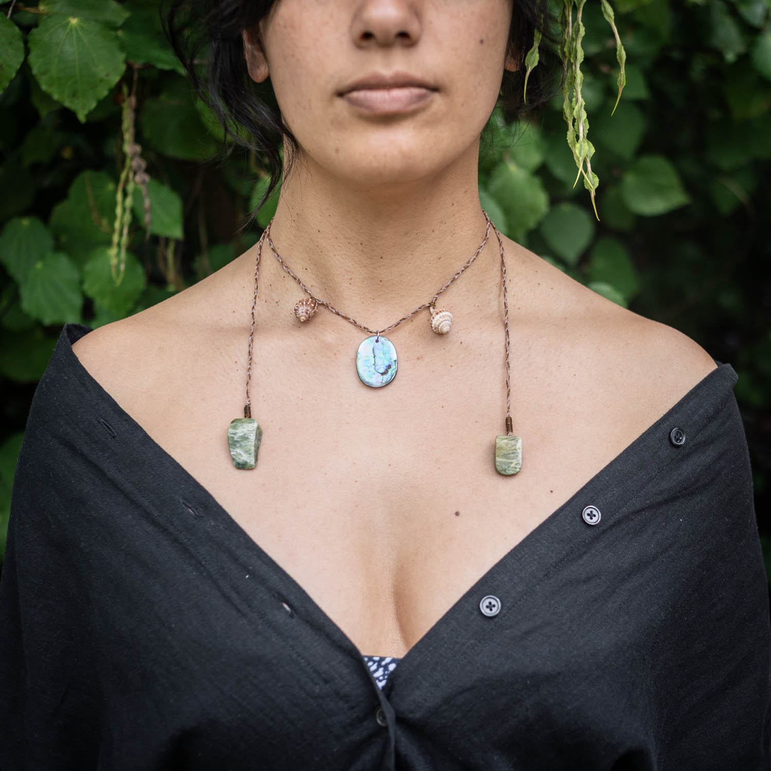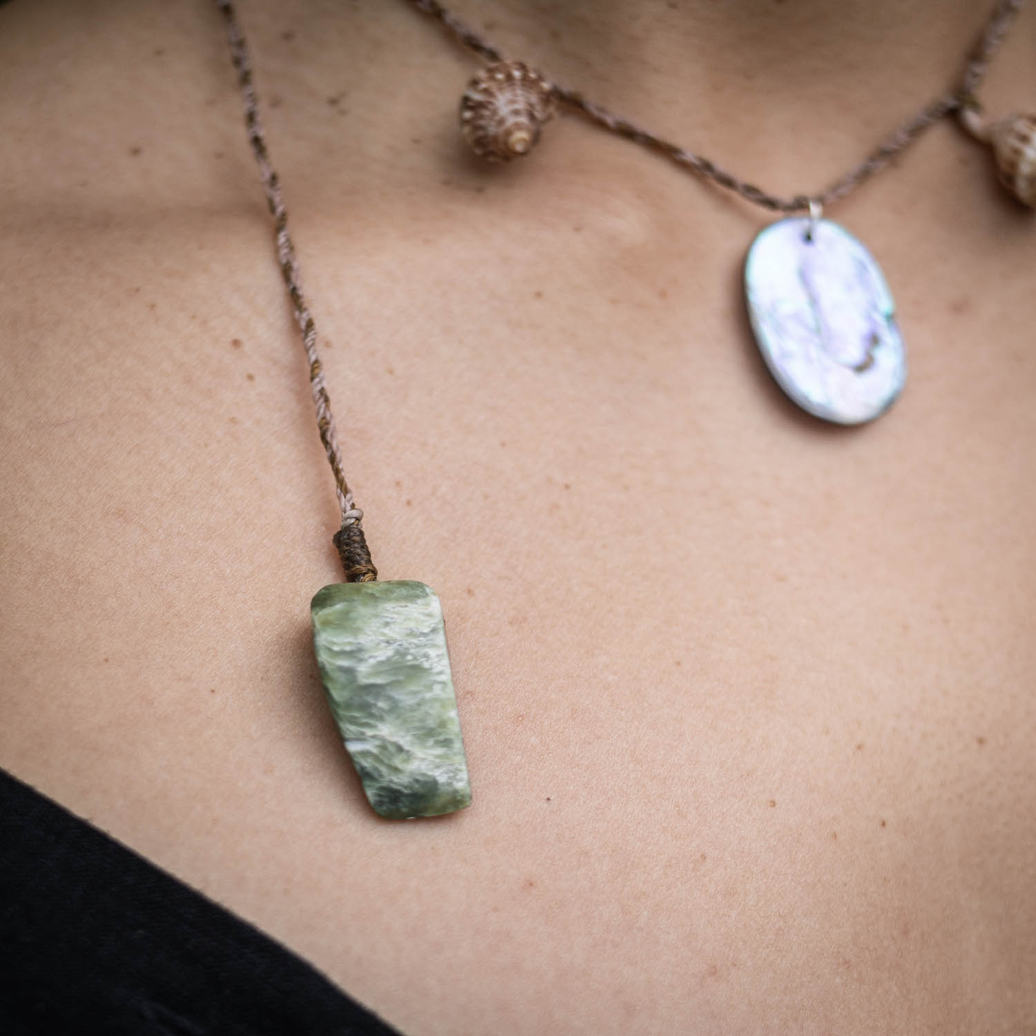 Materials: Rakiura Pāua, Ōtaki beach shells, Pounamu offcuts, waxed nylon cord.