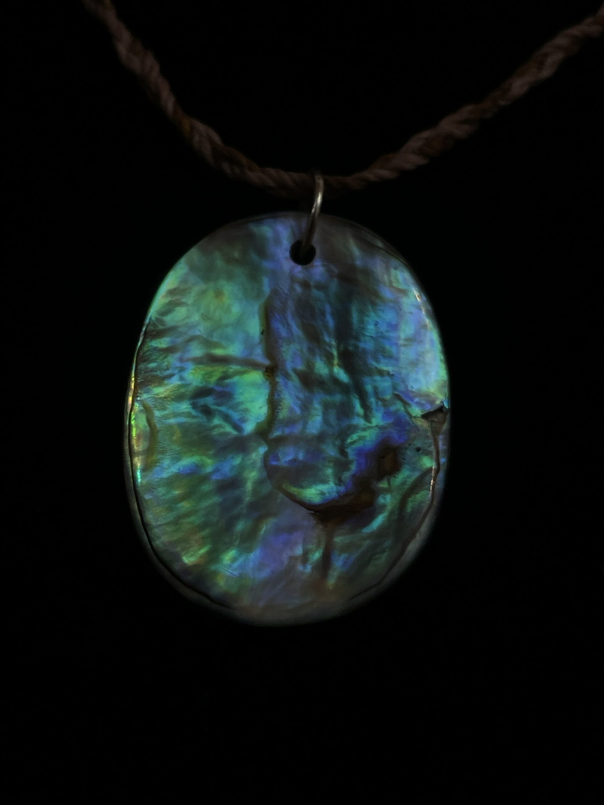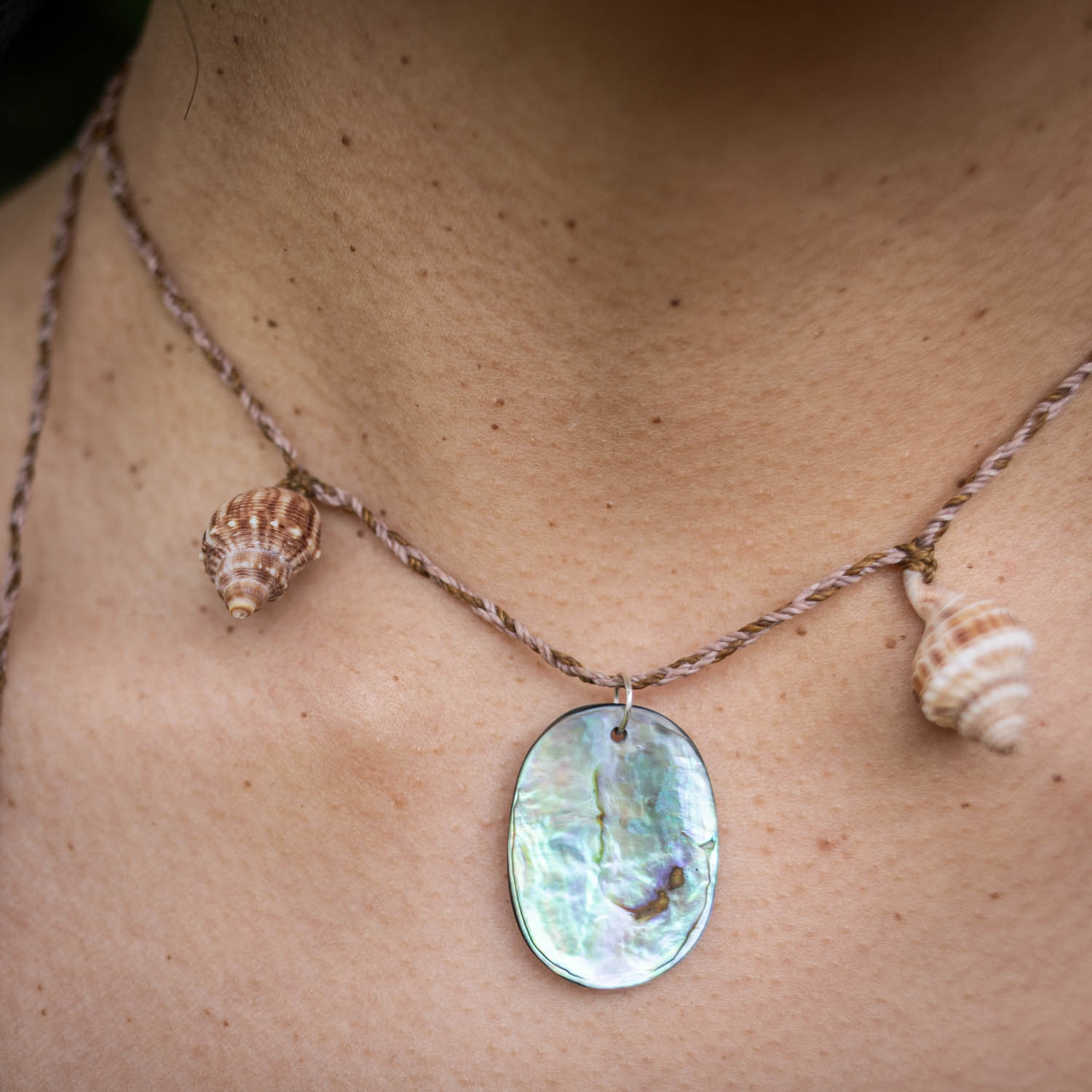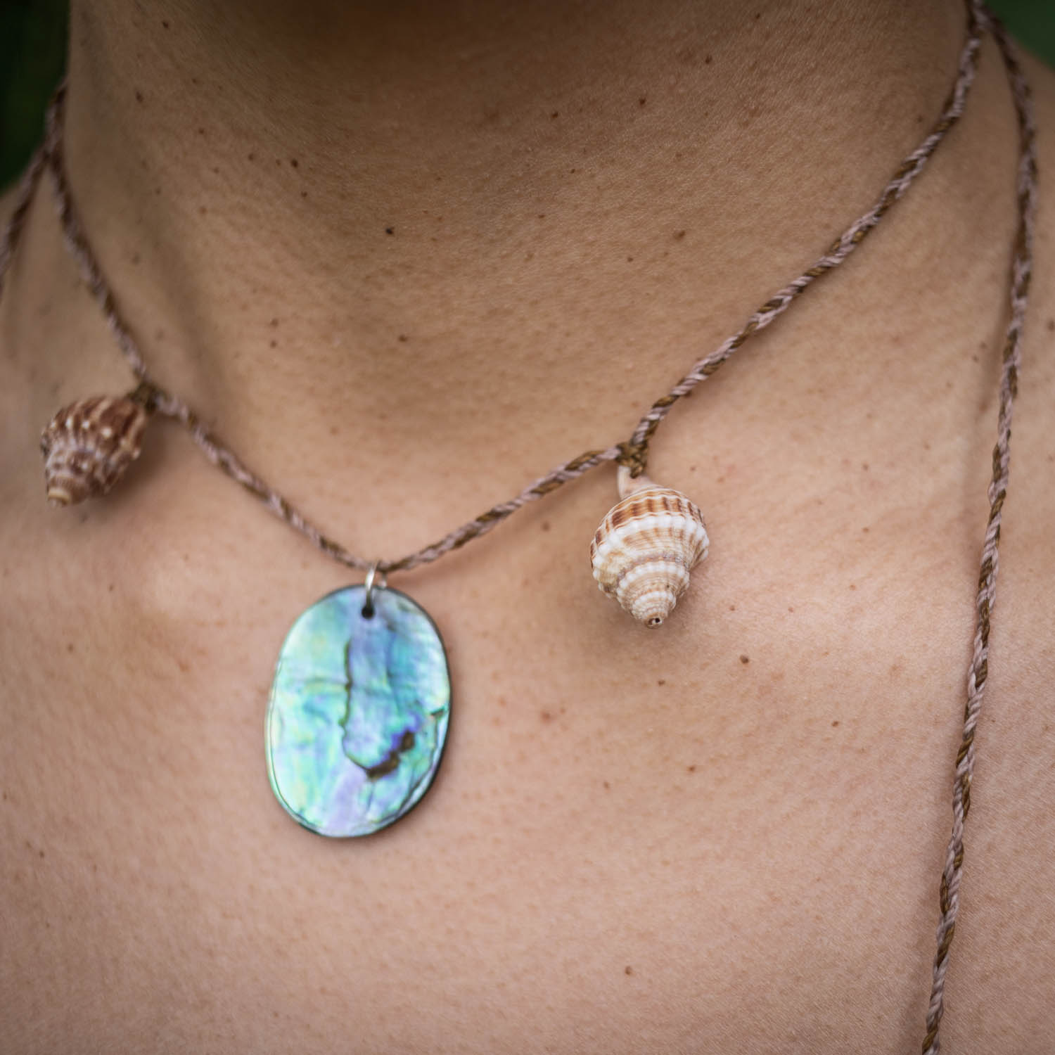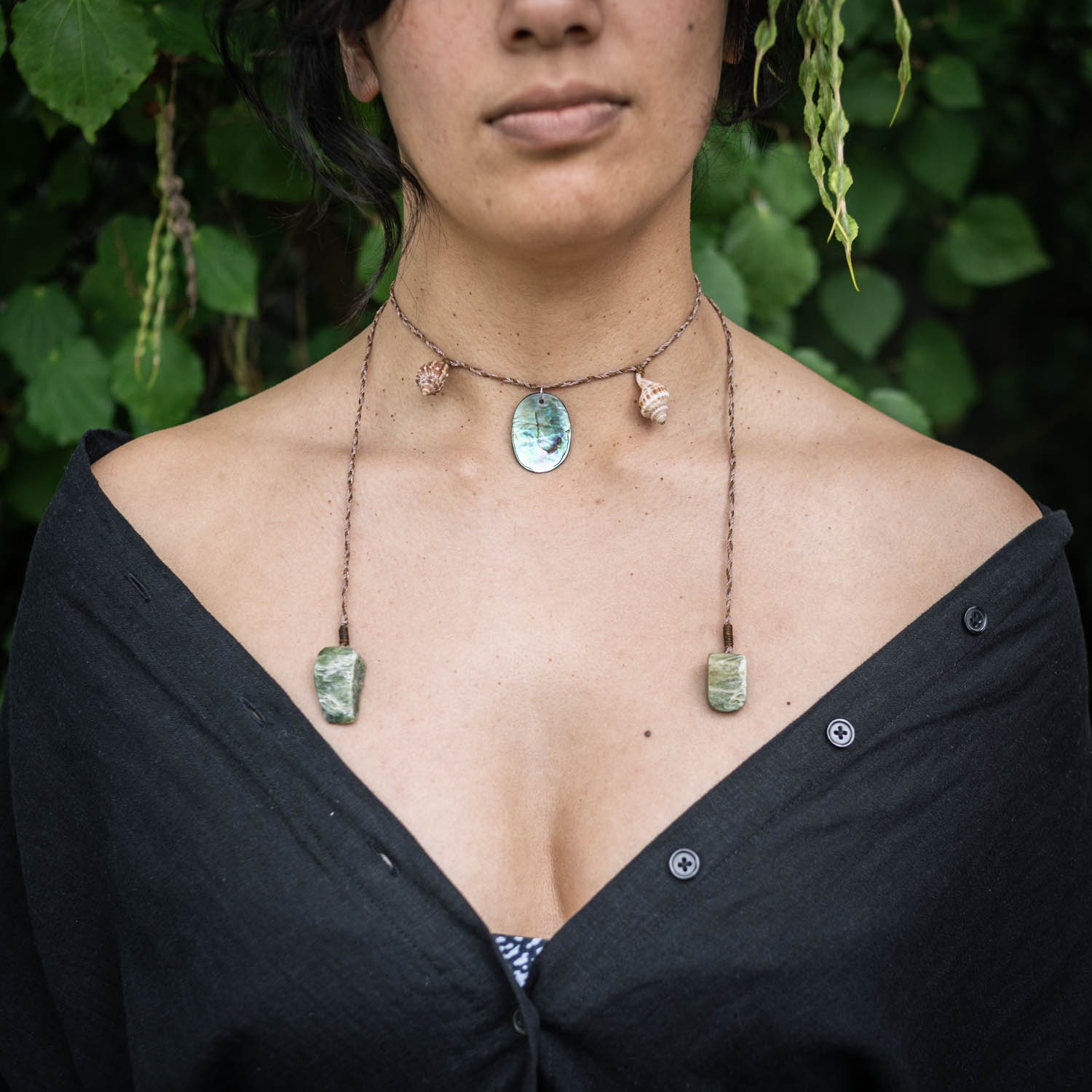 Materials: Rakiura Pāua, Ōtaki beach shells, Pounamu offcuts, waxed nylon cord.