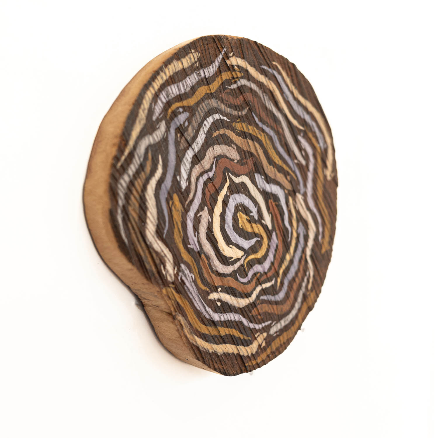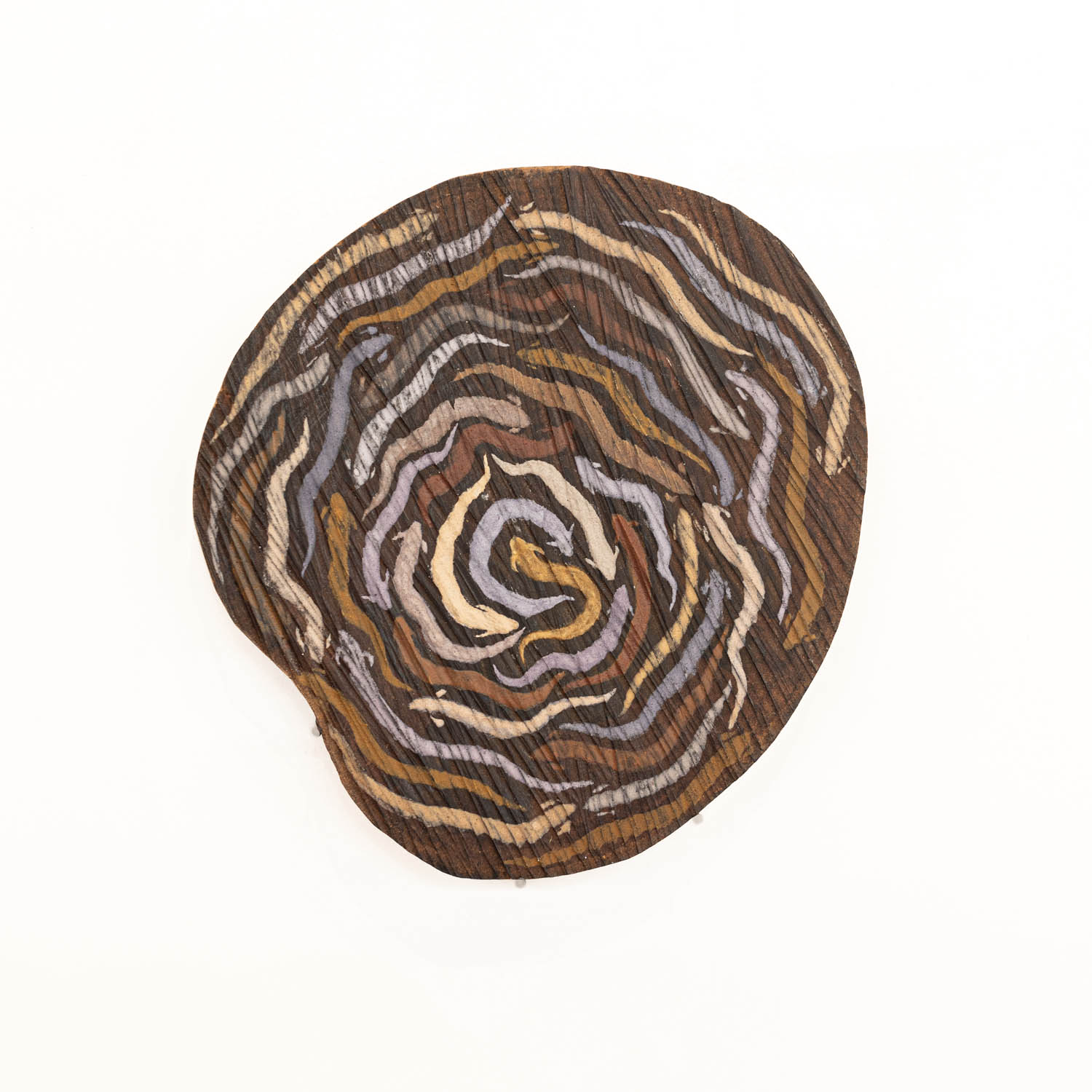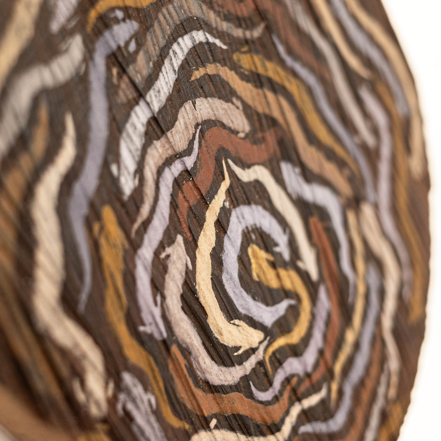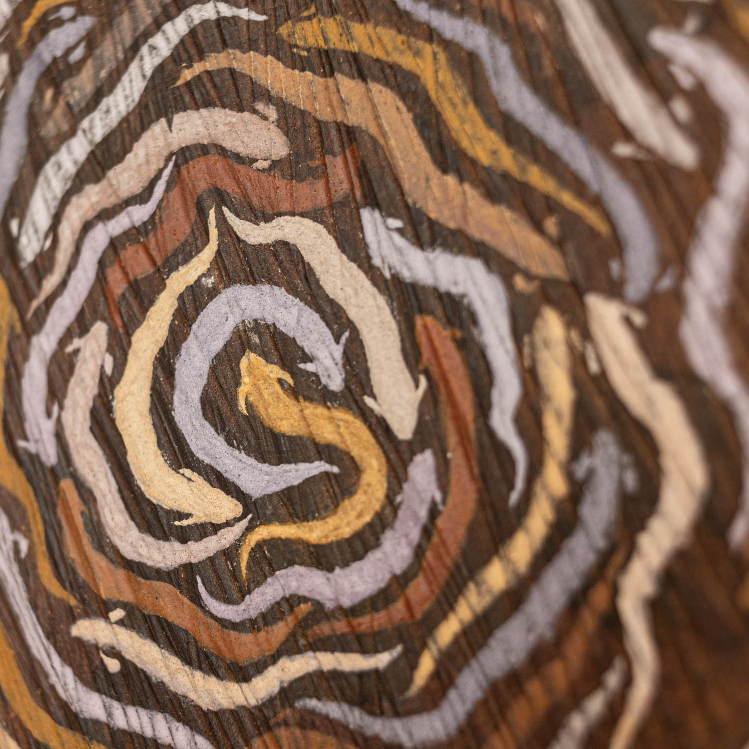 Materials: Manuka wood, Shell pigment: pink/purple made of Common Mussel (Scientific name: Mytilus Edulis), Earth pigment: Kokowai, yellow earth pigment sourced from Te Motu-Ārai-Roa, reddish/orange earth pigment gifted from Kānaka Maoli of Maui, Hawai’i
