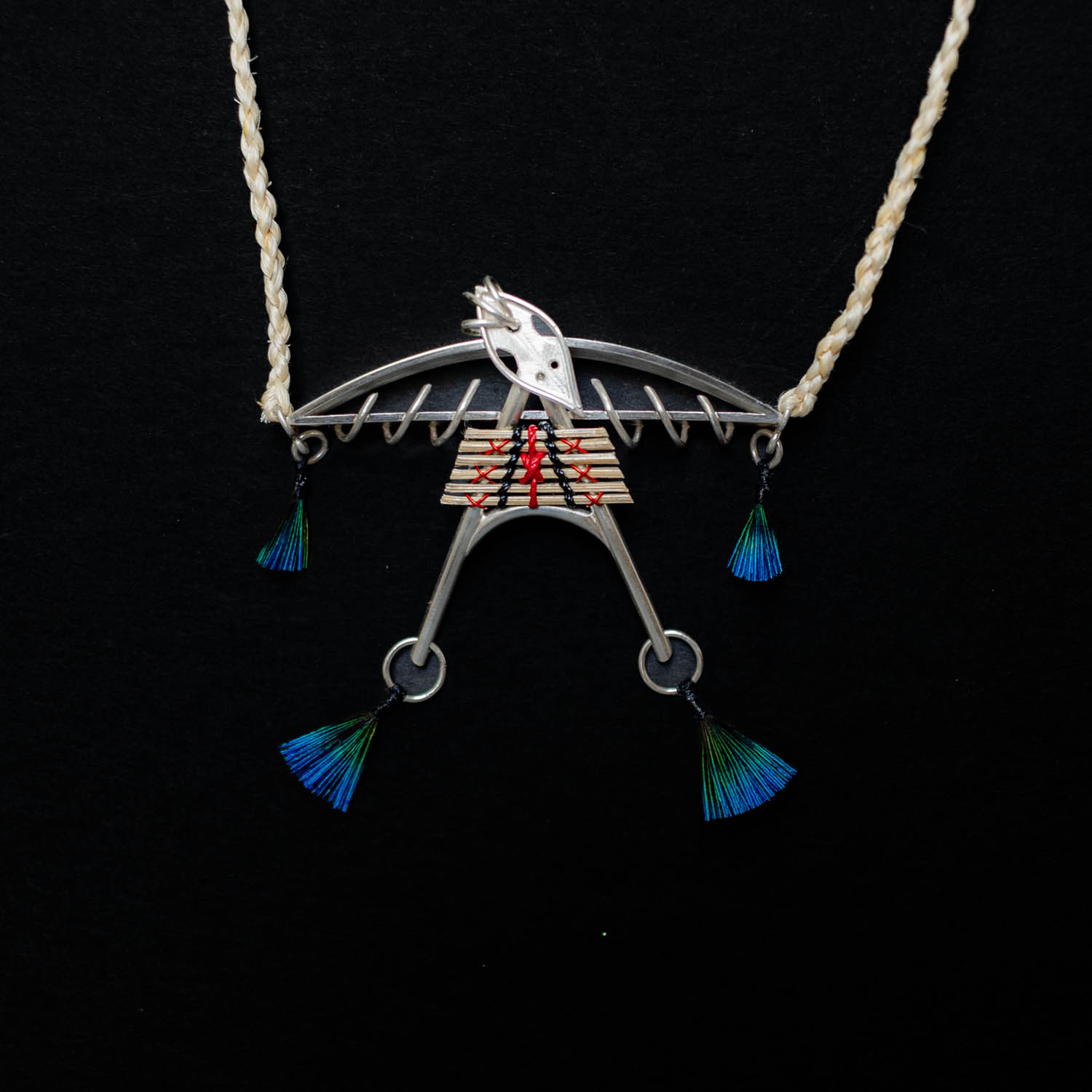Materials: Pure and sterling silver, South Westland Pounamu, Harakeke, Muka, copper wire, anodised copper wire, feathers, polyester thread