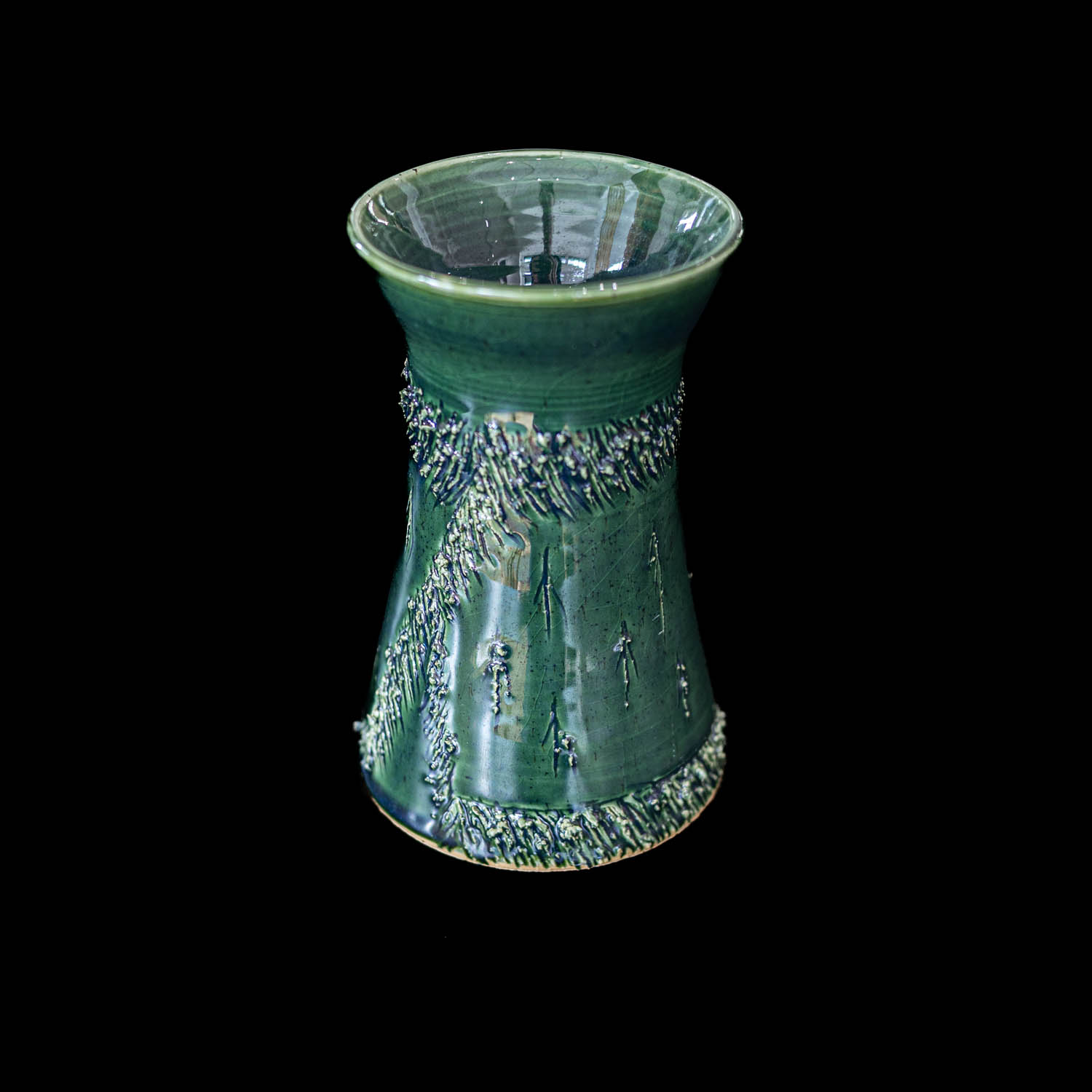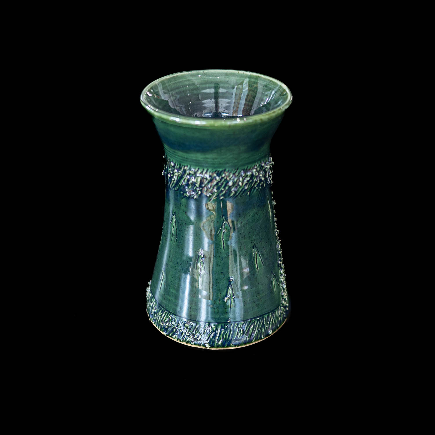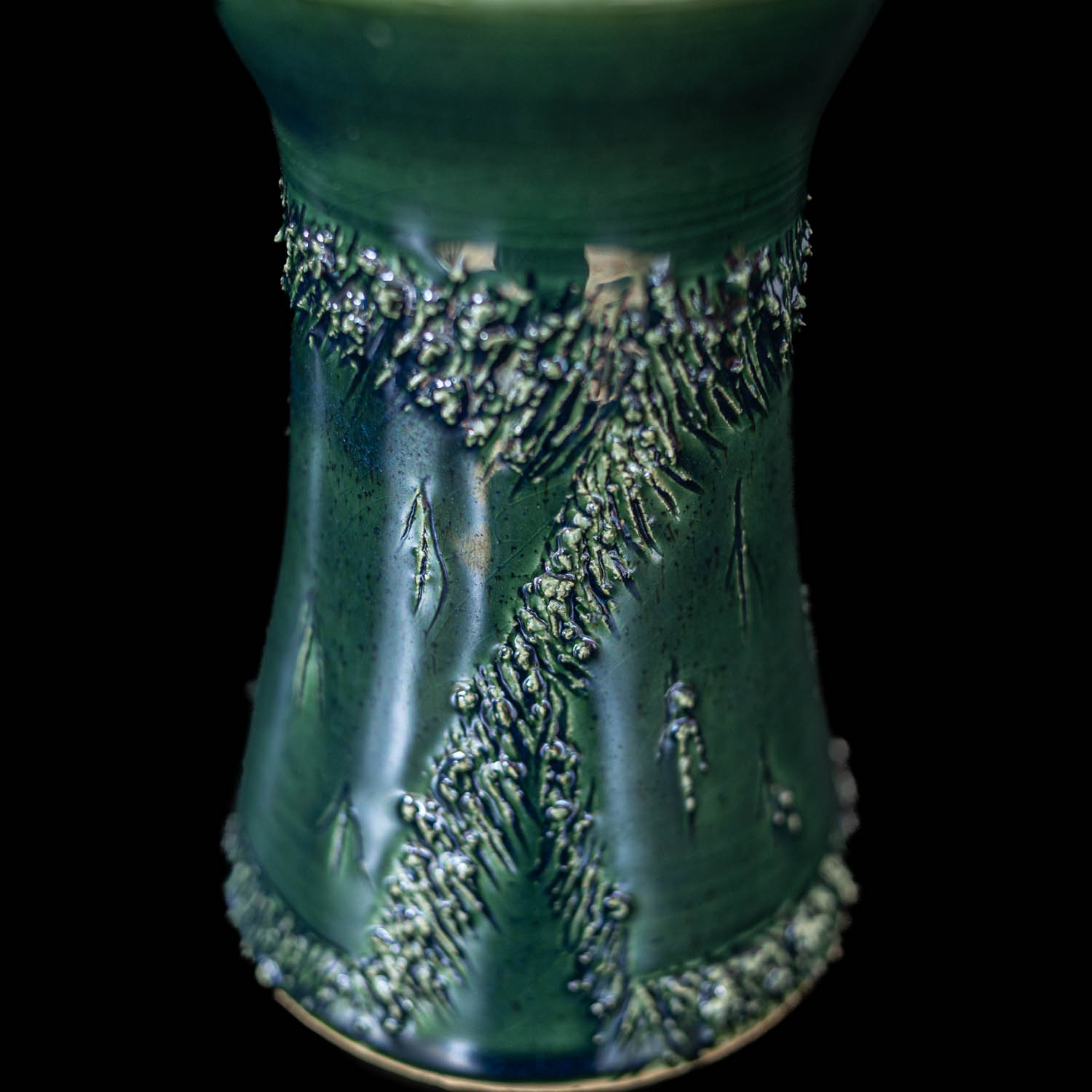 Materials: Speckled clay, Shaner Oribe glaze, brown underglaze