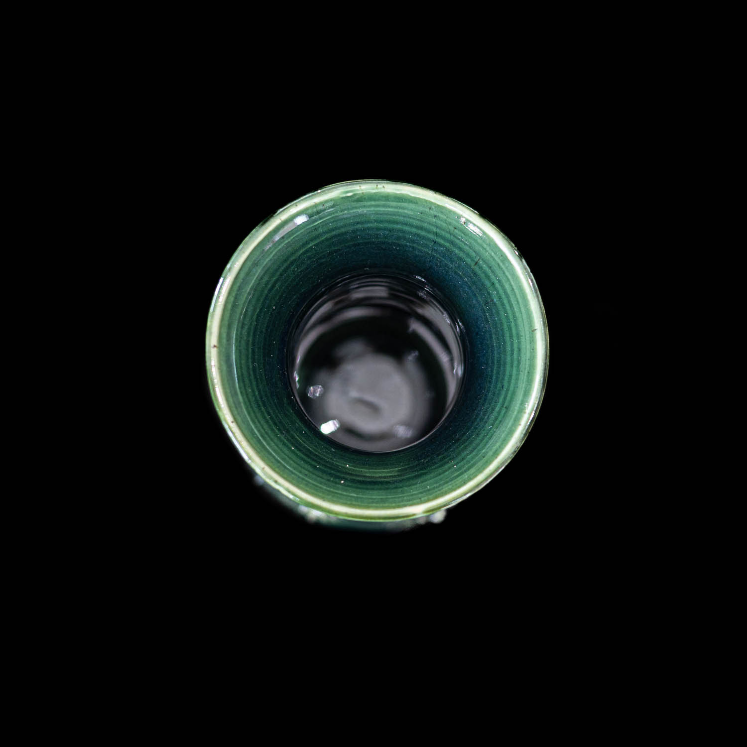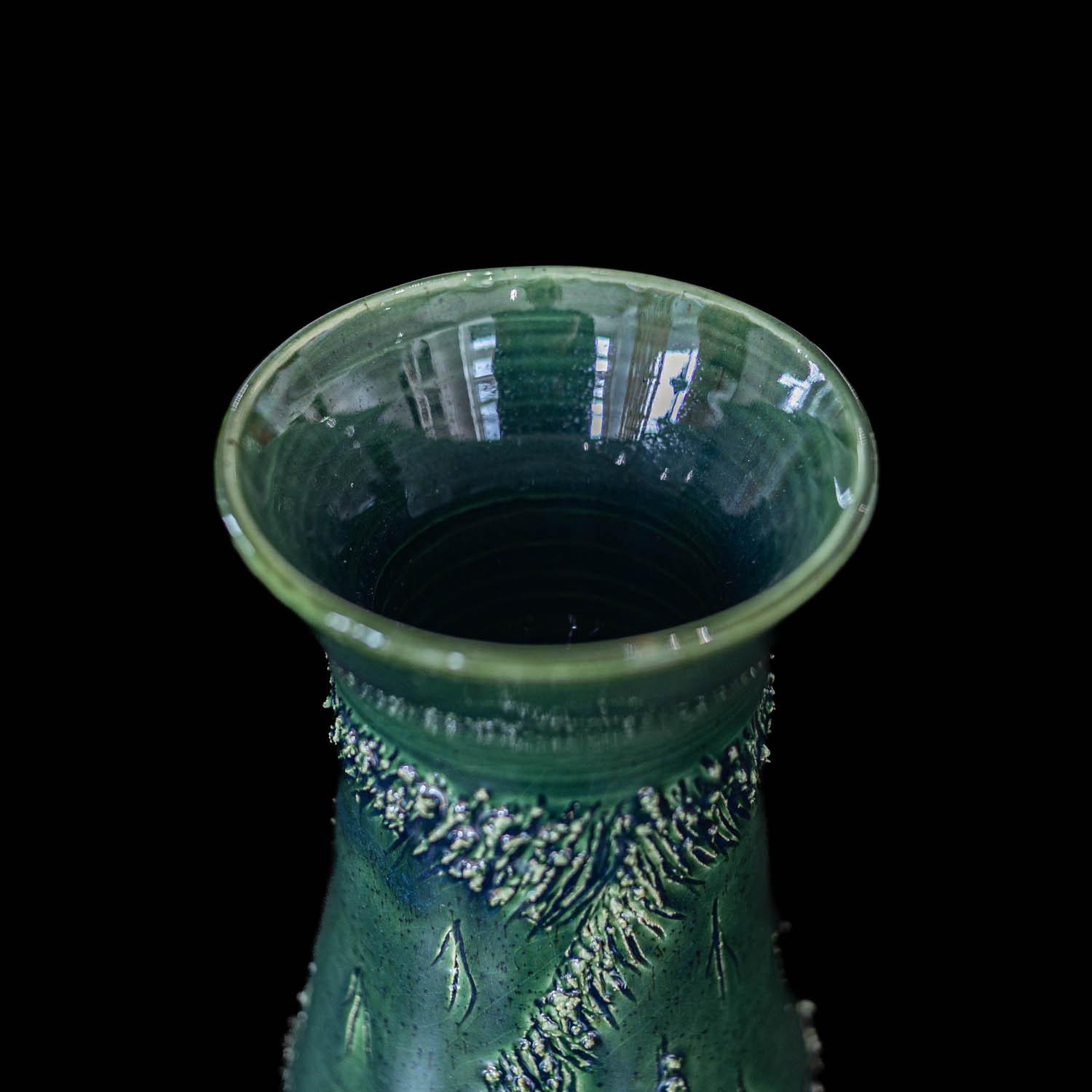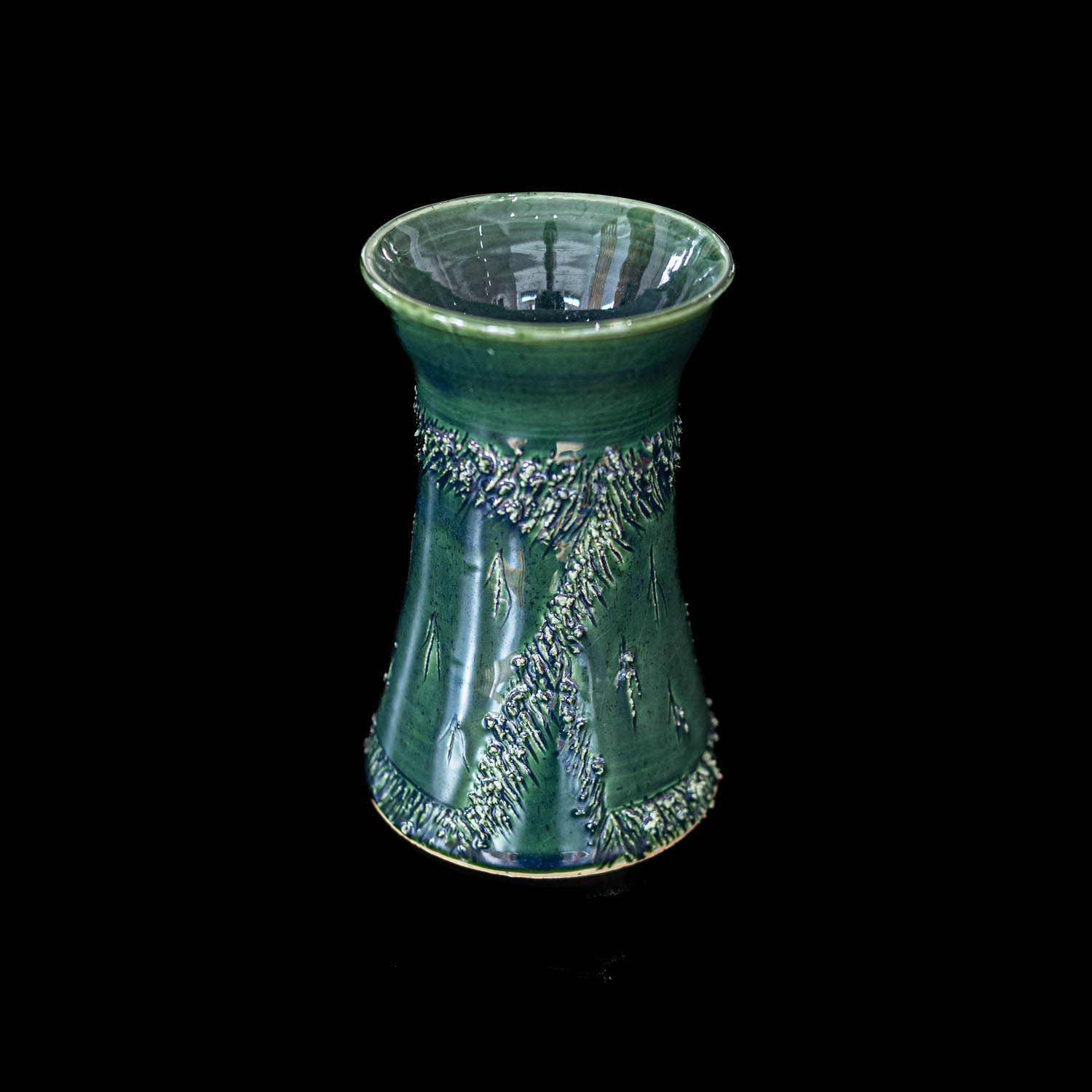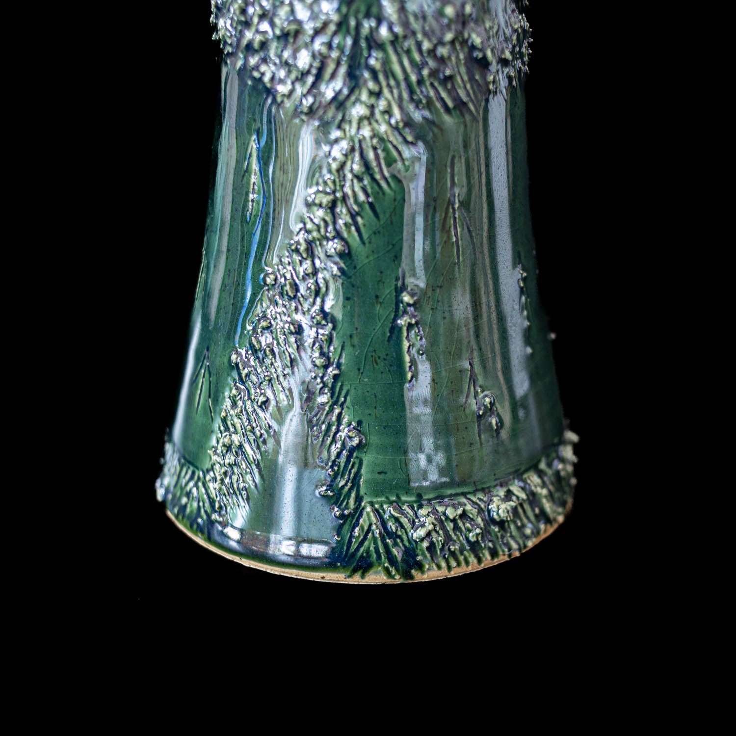 Materials: Speckled clay, Shaner Oribe glaze, brown underglaze