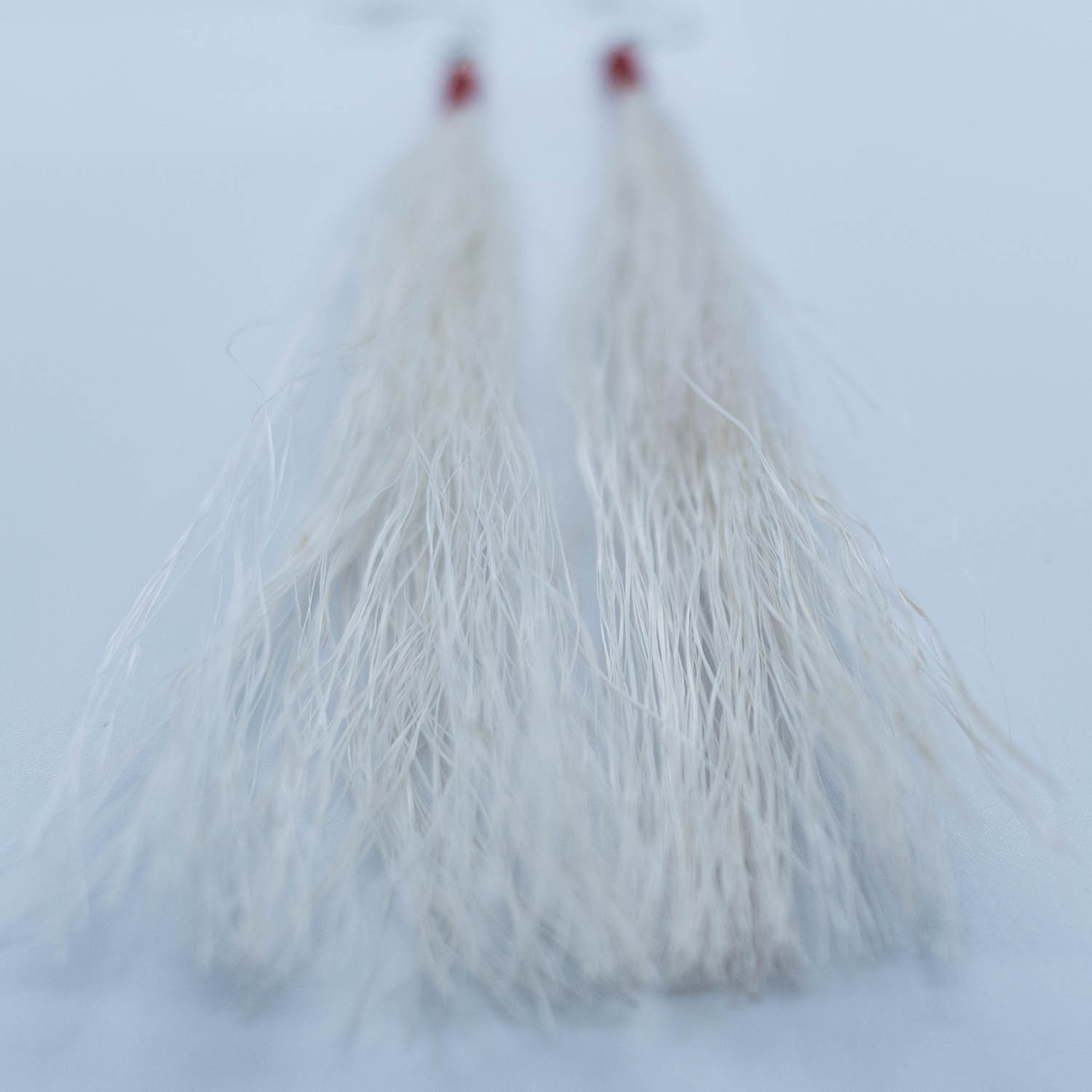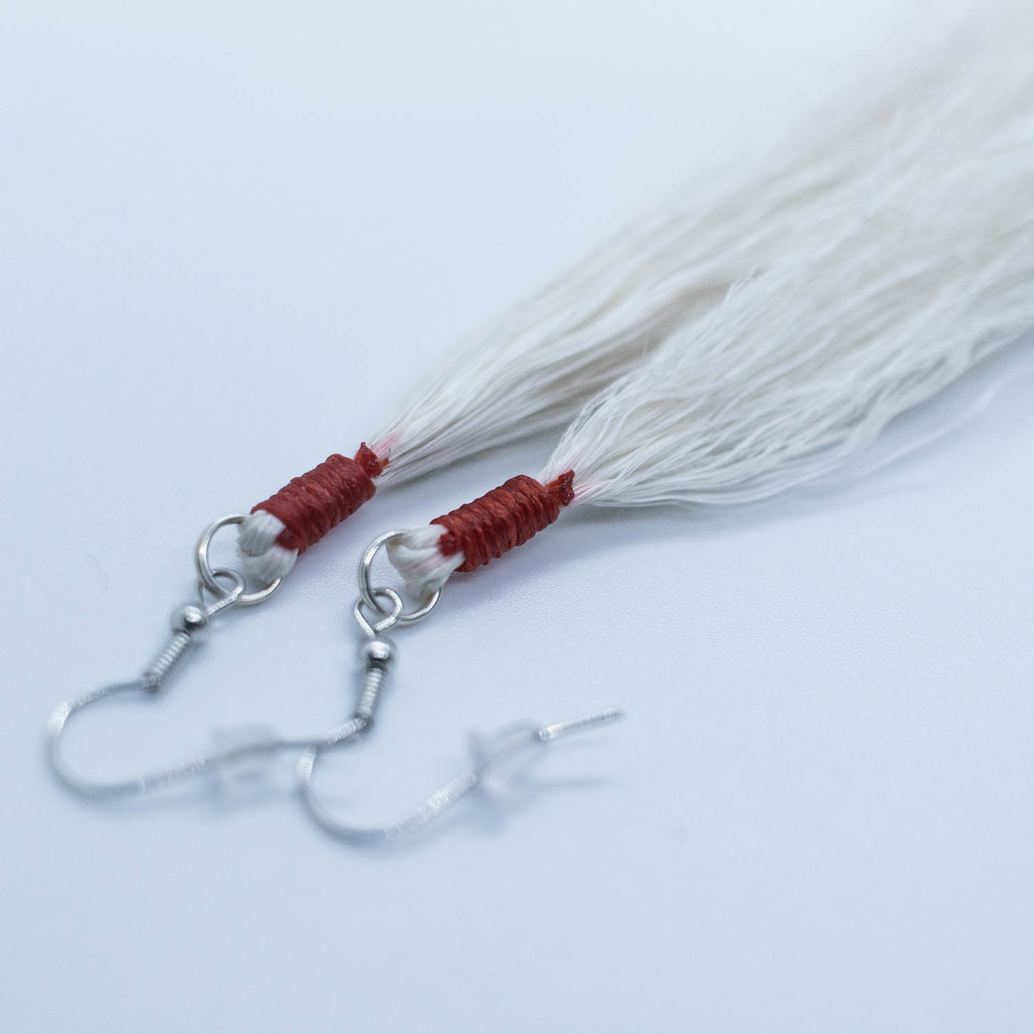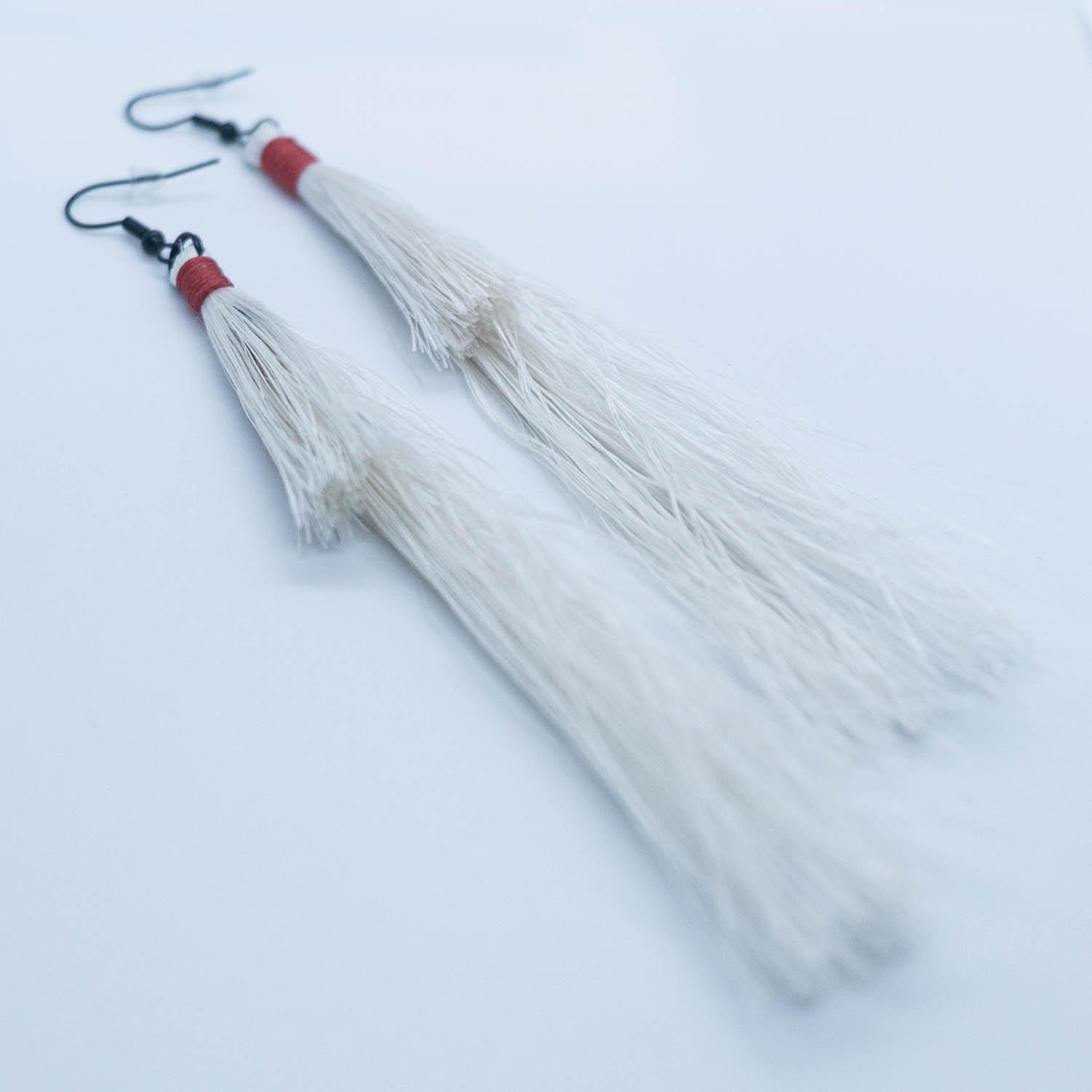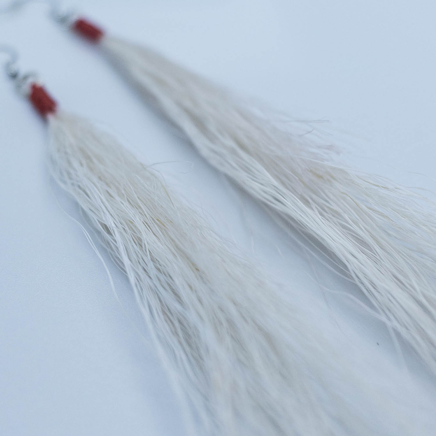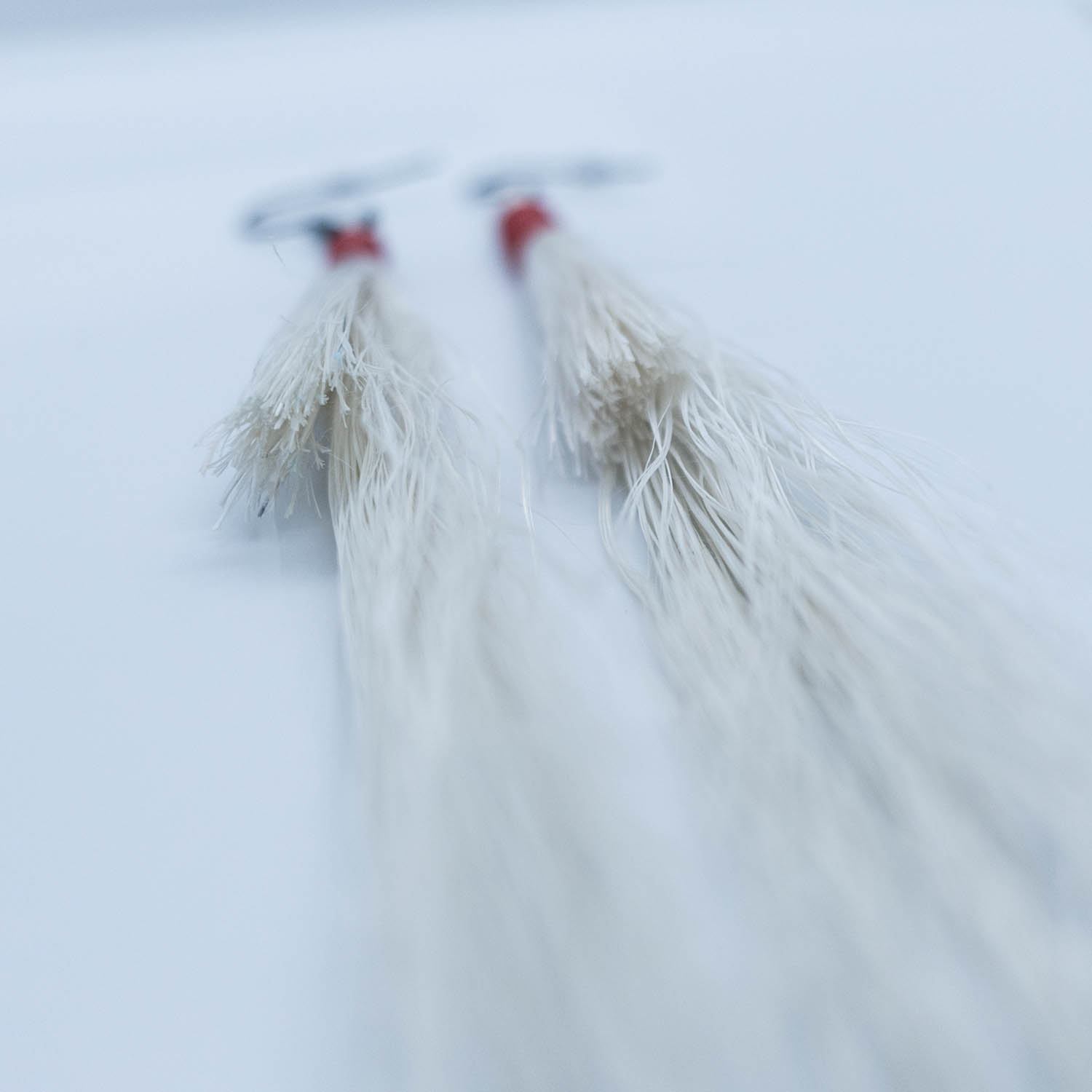 Materials: Muka Harakeke, silver and black hooks, red Jute