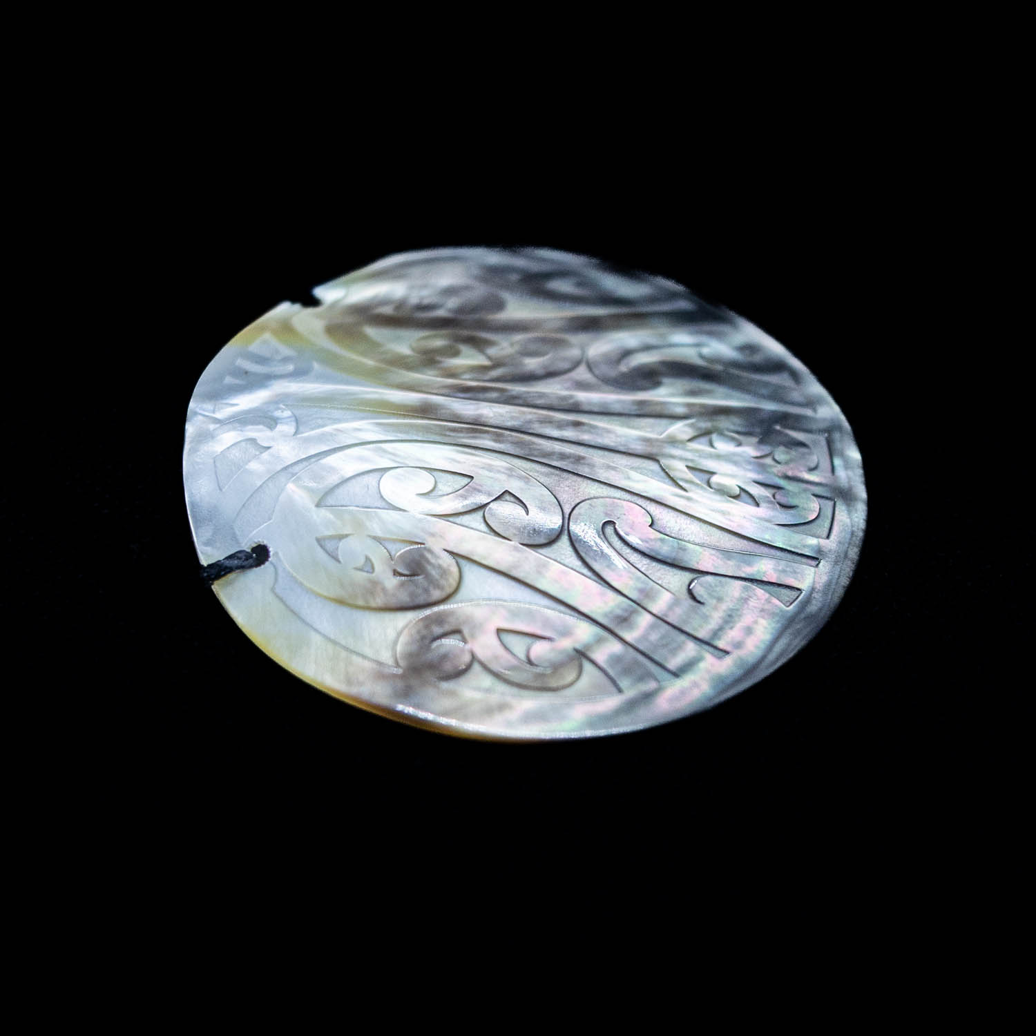 This Pacific black oyster mother-of-pearl shell pendant showcases an engraved Pitau design, a pattern that adorns the rafters within Whare Tupuna (Ancestral Houses) symbolizing unity and togetherness thus, the importance of whānau (family)