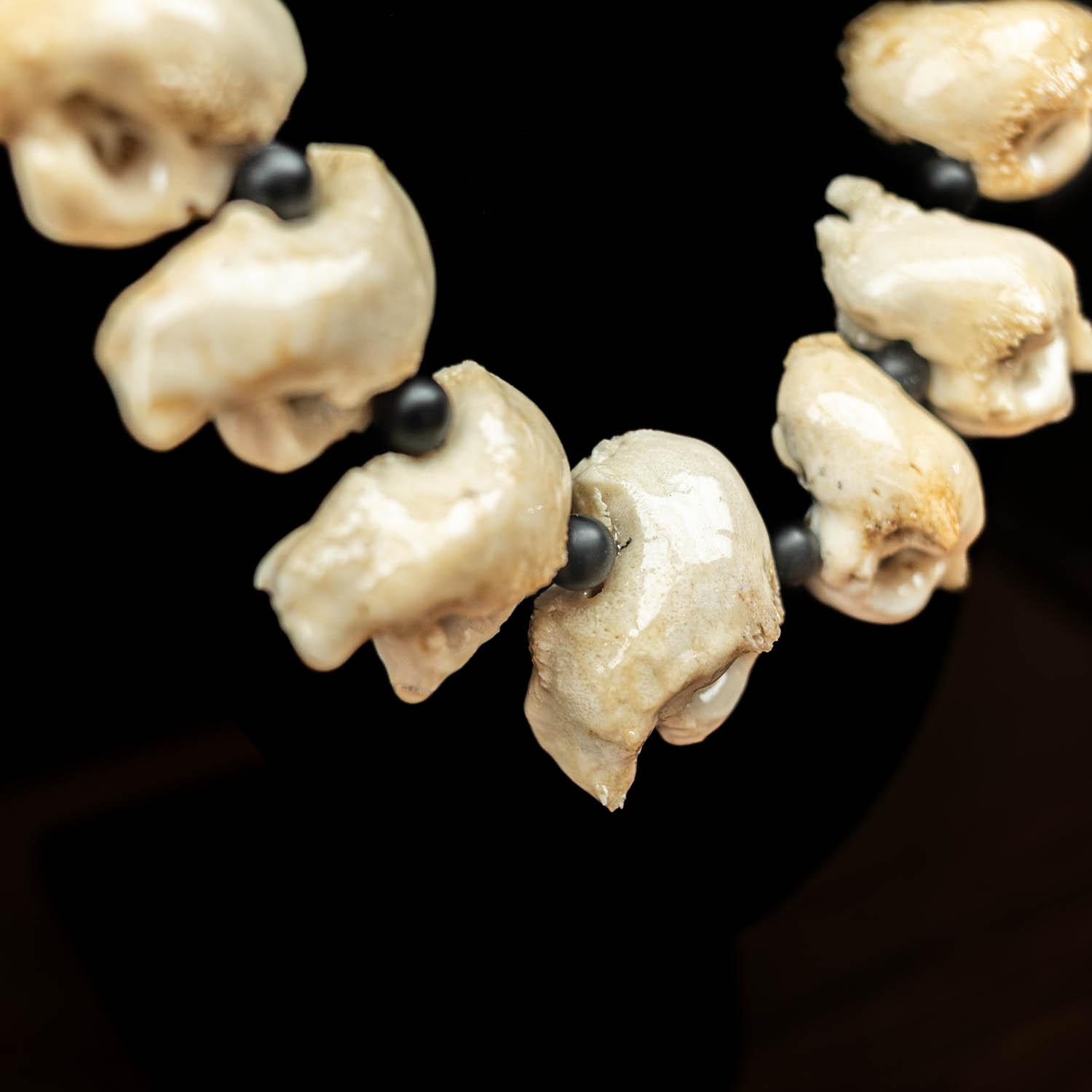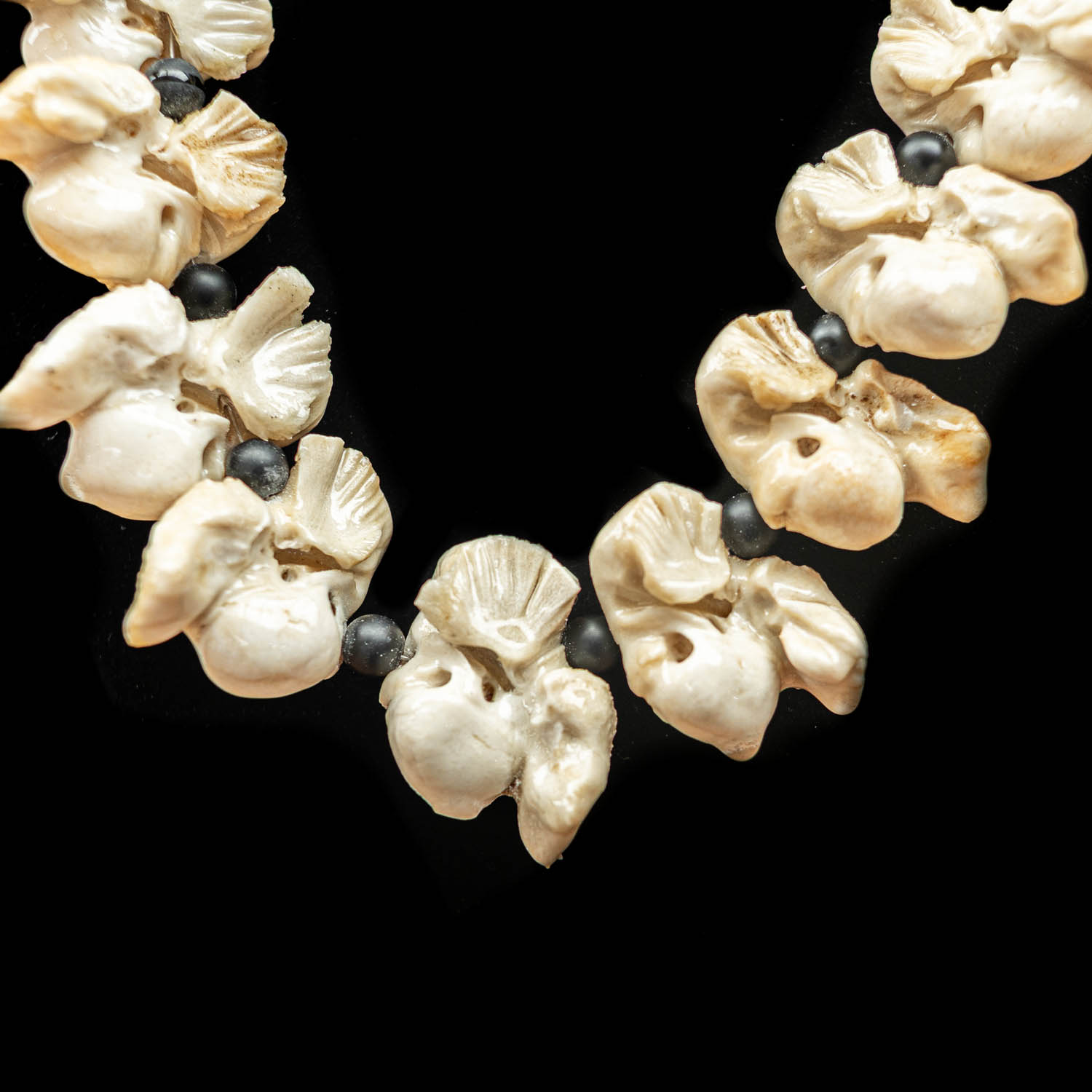 This necklace, fashioned from Parāoa – Pilot Whale – Ear bonne and Onyx, embodies the ancient and ongoing dialogue between ocean and stone, between the living currents of the moana and the deep silence of whenua.