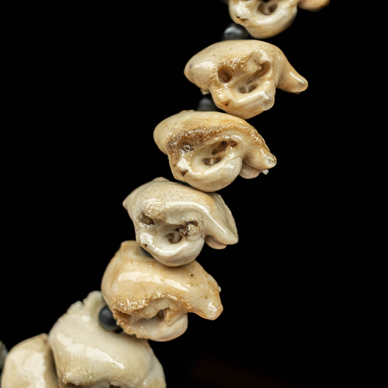 From a contemporary lens, this necklace becomes a modern day whakataukī, a proverb of listening along the way, when we move through the world with ears attuned to the whispers of place, of people and of spirit, beauty and meaning reveal themselves. Like the navigator guided by unseen currents, we discover that light is not something we chase, but something we hear – rising from the depths, carried in bone and stone, illuminating the path ahead.